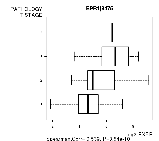 Figure S3. Get High-res Image As an example, this figure shows the association of EPR1|8475 to 'PATHOLOGY.T.STAGE'. P value = 3.54e-10 with Spearman correlation analysis.