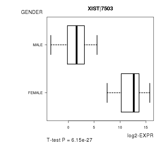 Figure S5. Get High-res Image As an example, this figure shows the association of XIST|7503 to 'GENDER'. P value = 6.15e-27 with T-test analysis.