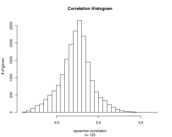 Figure 1. Histogram of methylation correlation values. n is the number of matched samples between Level 3 CpG site methylation and Level 3 gene expression arrays. Number of Matched Samples = 125