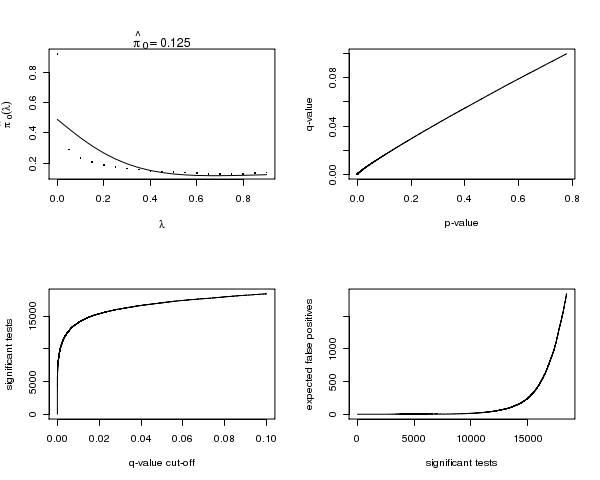 Figure 2. Plot 1. The estimated pi_0 versus the tuning parameter lambda. Plot 2. The q-values versus the p-values. Plot 3. The number of significant tests versus each q-value cutoff. Plot 4. The number of expected false positives versus the number of significant tests.The first is a plot of the estimate of pi_0 versus its tuning parameter lambda. In most cases, as lambda gets larger, the bias of the estimate decreases, yet the variance increases. Comparing your estimate of pi_0 to this plot allows one to guage its quality. The remaining three plots show how many tests are significant, as well as how many false positives to expect for each q-value cut-off.