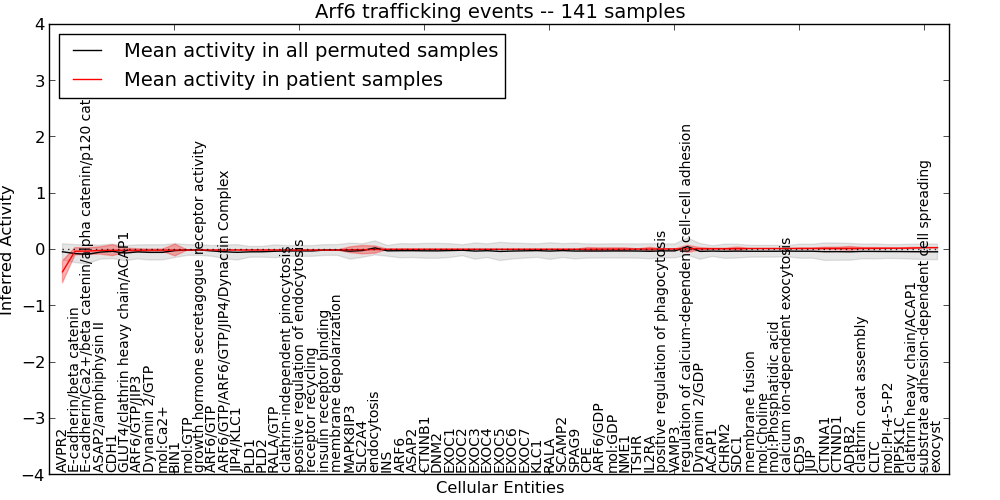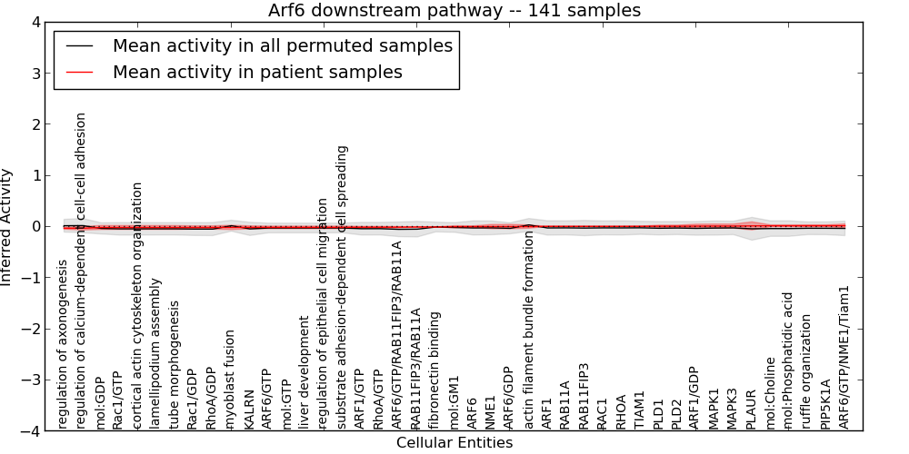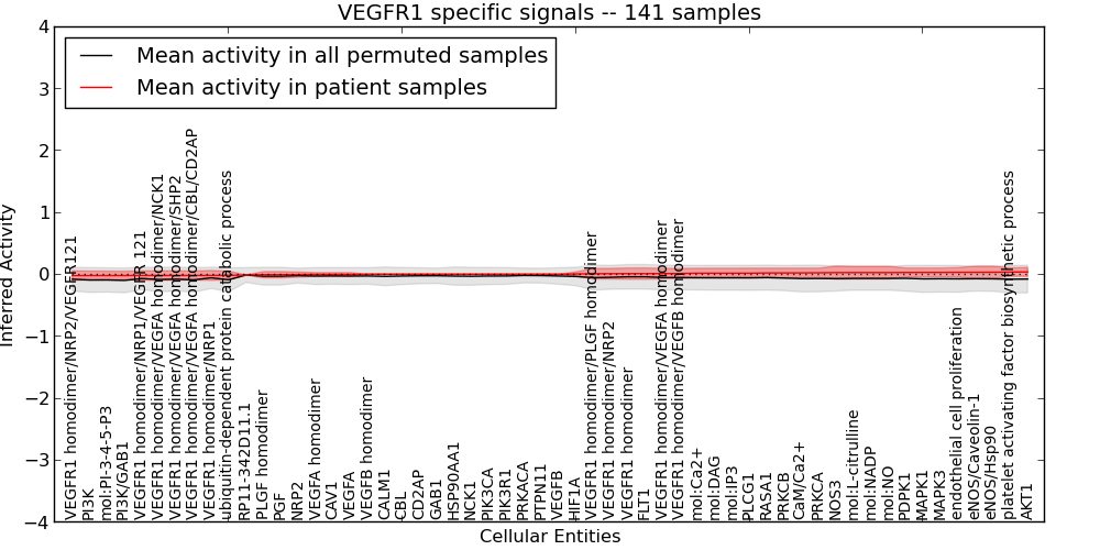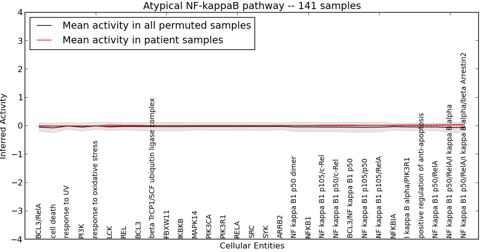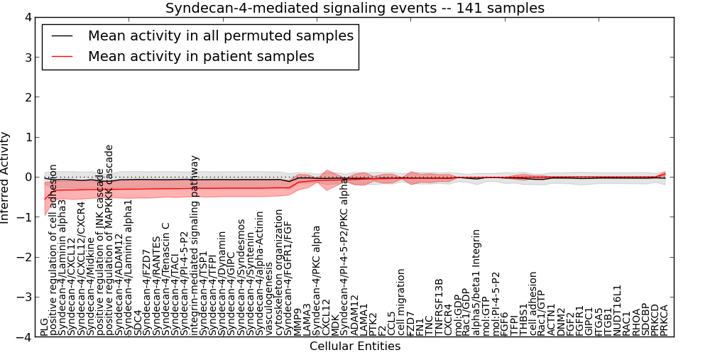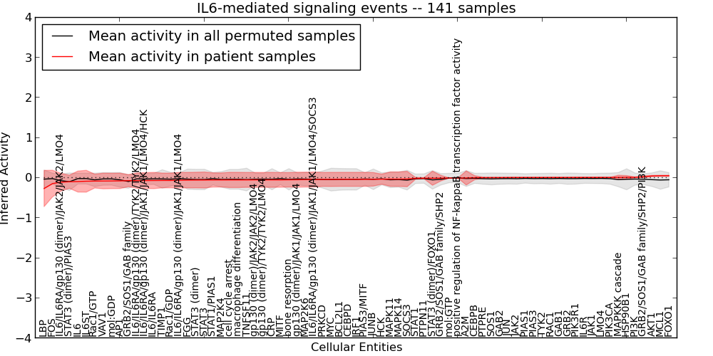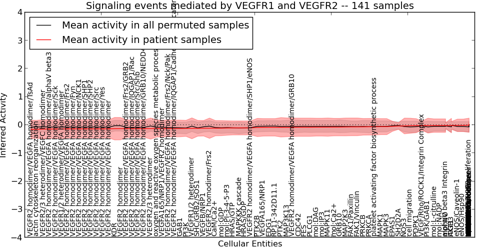 Figure S131. Get High-res Image This plot shows pathway concept perturbations across all samples against a permutation model. The concepts along the x-axis are sorted by lowest to highest mean activity for the real patient samples. Mean inferred activities are plotted along the y-axis as a colored band showing the average level and one standard deviation range. Real samples are shown in red and permuted samples in black.