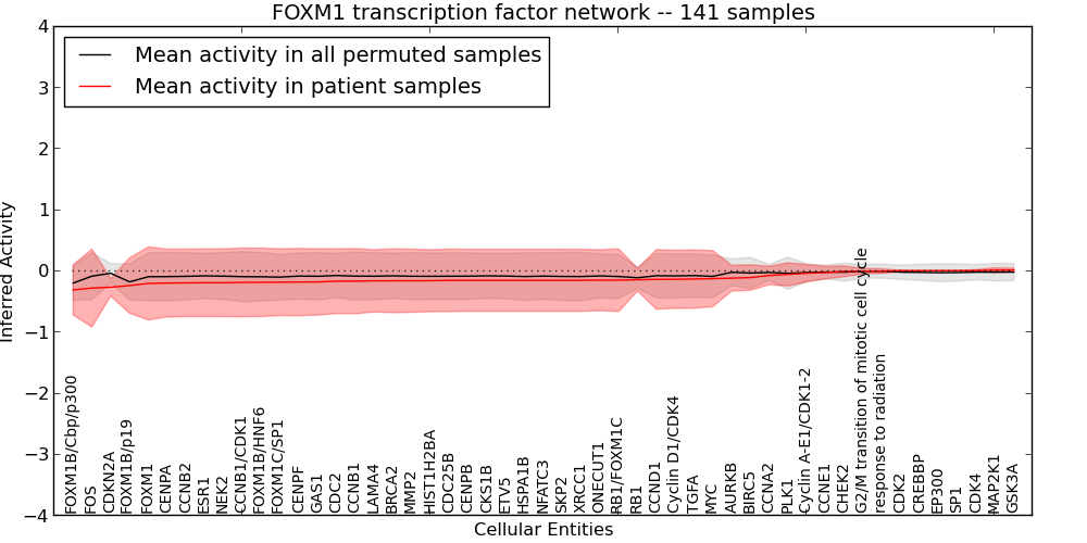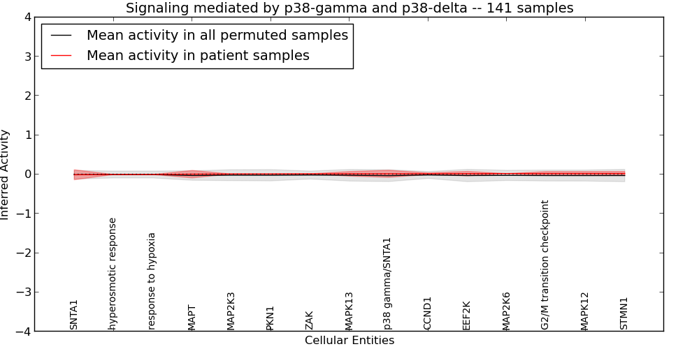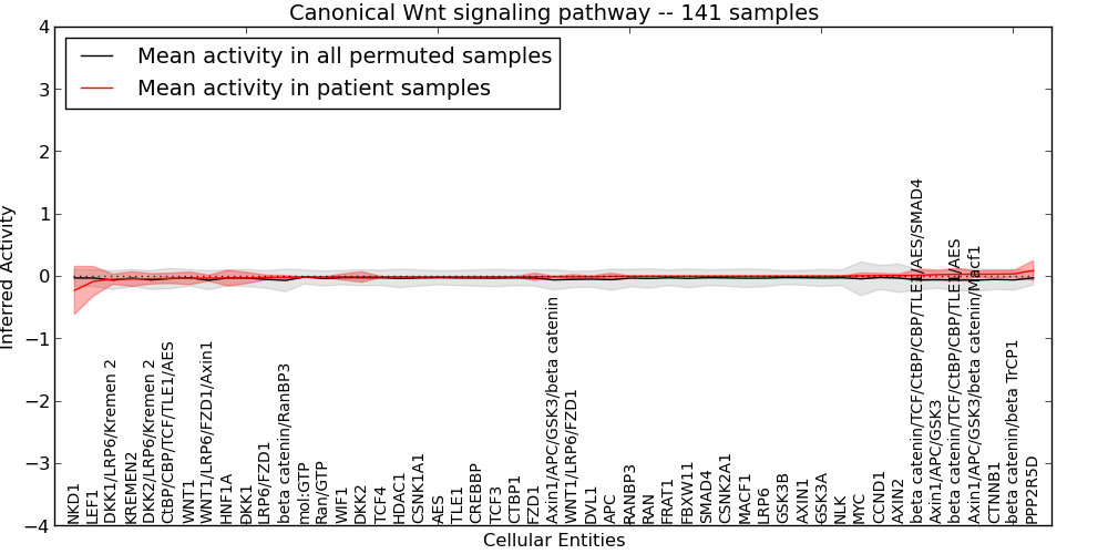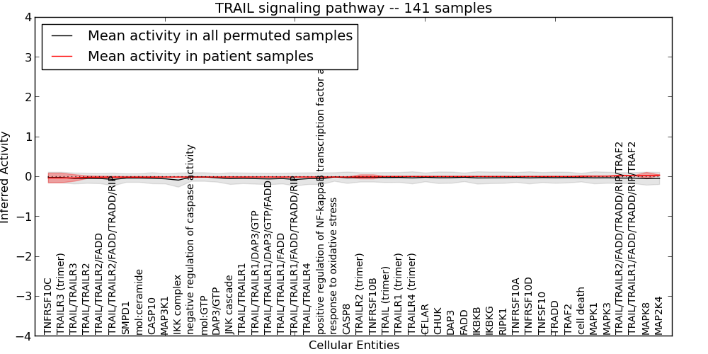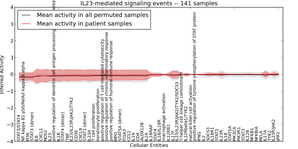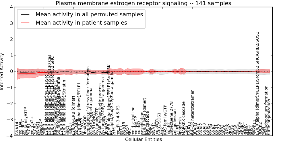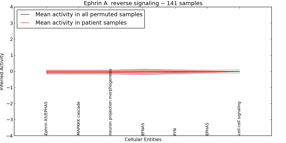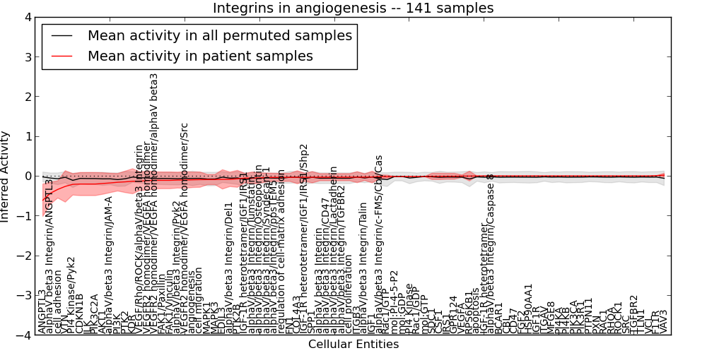Figure S131. Get High-res Image This plot shows pathway concept perturbations across all samples against a permutation model. The concepts along the x-axis are sorted by lowest to highest mean activity for the real patient samples. Mean inferred activities are plotted along the y-axis as a colored band showing the average level and one standard deviation range. Real samples are shown in red and permuted samples in black.