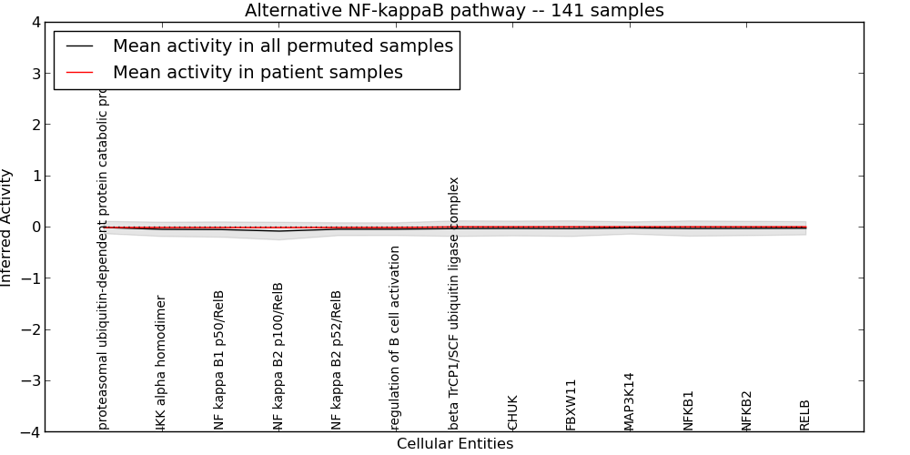 Figure S130. Get High-res Image This plot shows pathway concept perturbations across all samples against a permutation model. The concepts along the x-axis are sorted by lowest to highest mean activity for the real patient samples. Mean inferred activities are plotted along the y-axis as a colored band showing the average level and one standard deviation range. Real samples are shown in red and permuted samples in black.