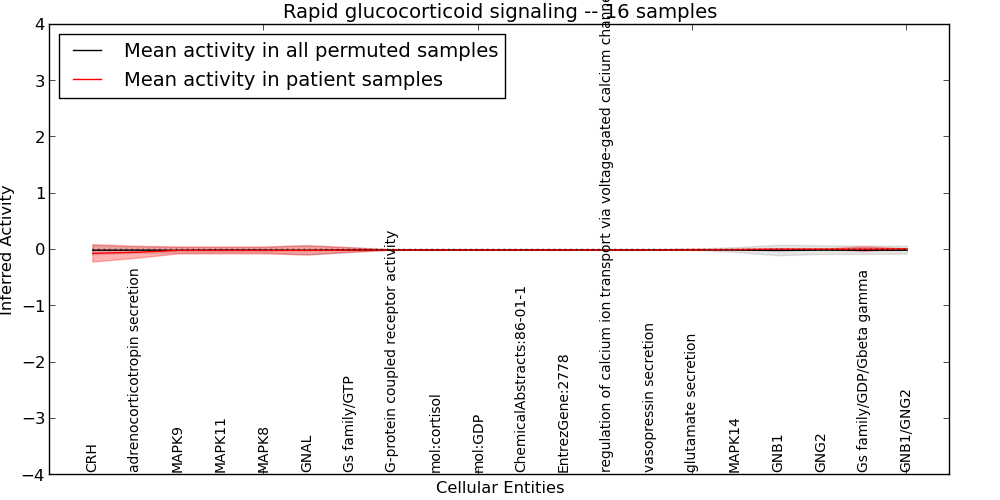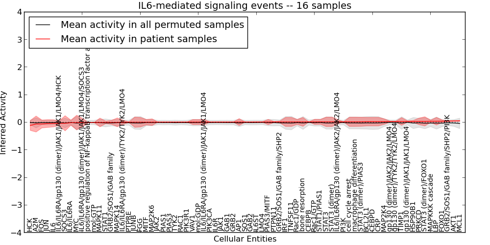 Figure S131. Get High-res Image This plot shows pathway concept perturbations across all samples against a permutation model. The concepts along the x-axis are sorted by lowest to highest mean activity for the real patient samples. Mean inferred activities are plotted along the y-axis as a colored band showing the average level and one standard deviation range. Real samples are shown in red and permuted samples in black.