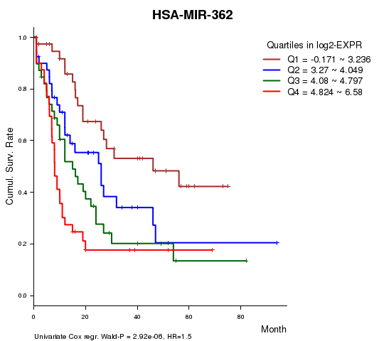 Figure S1. Get High-res Image As an example, this figure shows the association of HSA-MIR-362 to 'Time to Death'. four curves present the cumulative survival rates of 4 quartile subsets of patients. P value = 2.92e-06 with univariate Cox regression analysis using continuous log-2 expression values.