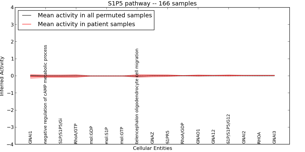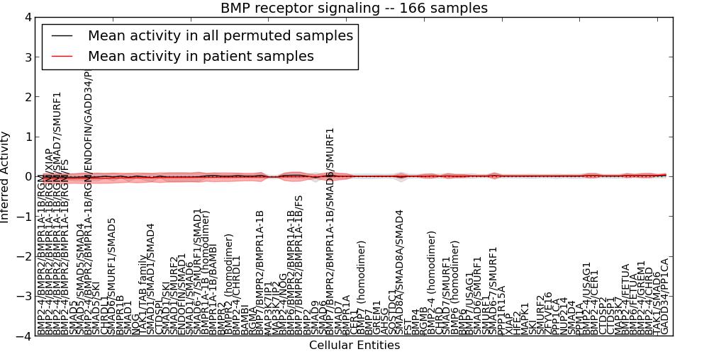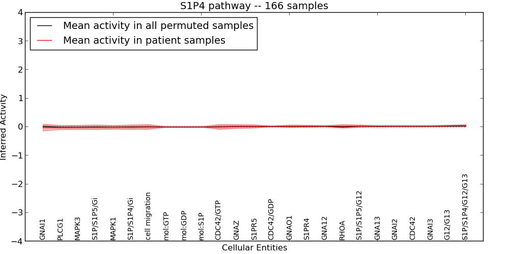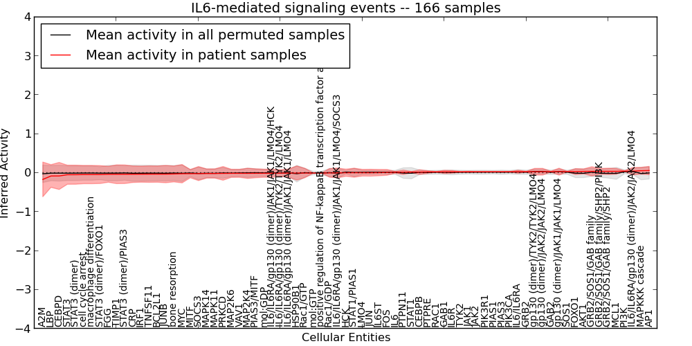 Figure S131. Get High-res Image This plot shows pathway concept perturbations across all samples against a permutation model. The concepts along the x-axis are sorted by lowest to highest mean activity for the real patient samples. Mean inferred activities are plotted along the y-axis as a colored band showing the average level and one standard deviation range. Real samples are shown in red and permuted samples in black.