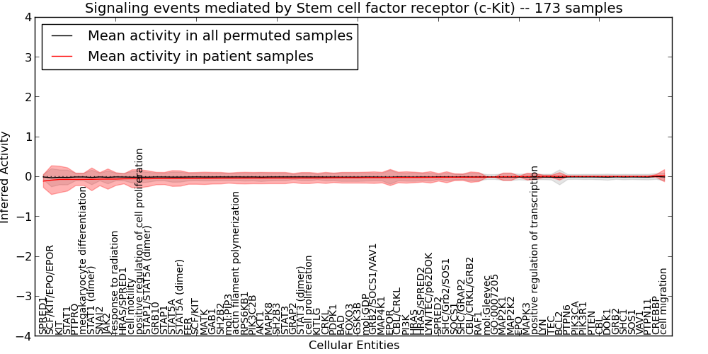 Figure S131. Get High-res Image This plot shows pathway concept perturbations across all samples against a permutation model. The concepts along the x-axis are sorted by lowest to highest mean activity for the real patient samples. Mean inferred activities are plotted along the y-axis as a colored band showing the average level and one standard deviation range. Real samples are shown in red and permuted samples in black.