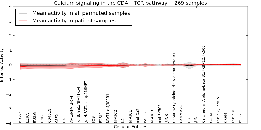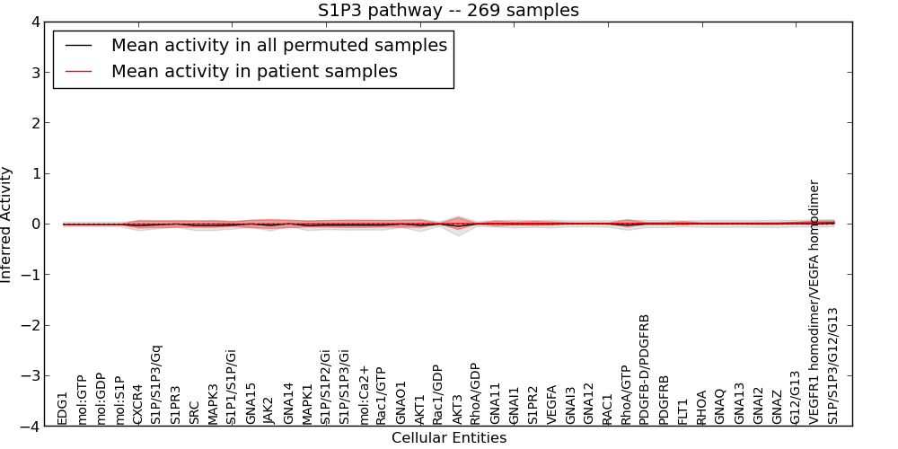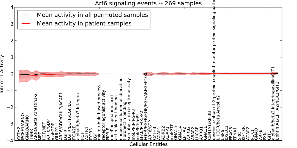 Figure S131. Get High-res Image This plot shows pathway concept perturbations across all samples against a permutation model. The concepts along the x-axis are sorted by lowest to highest mean activity for the real patient samples. Mean inferred activities are plotted along the y-axis as a colored band showing the average level and one standard deviation range. Real samples are shown in red and permuted samples in black.