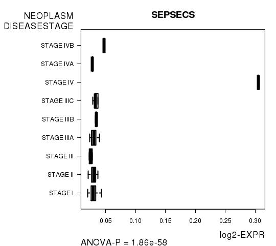 Figure S3. Get High-res Image As an example, this figure shows the association of SEPSECS to 'NEOPLASM.DISEASESTAGE'. P value = 1.86e-58 with ANOVA analysis.