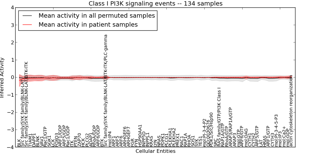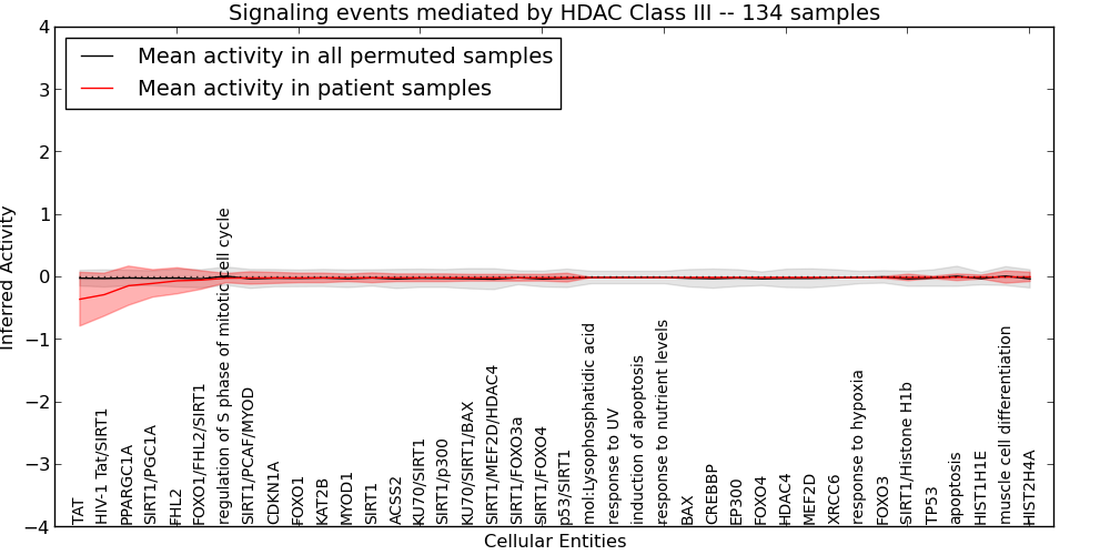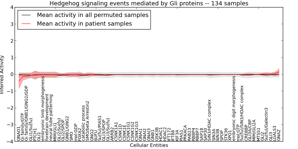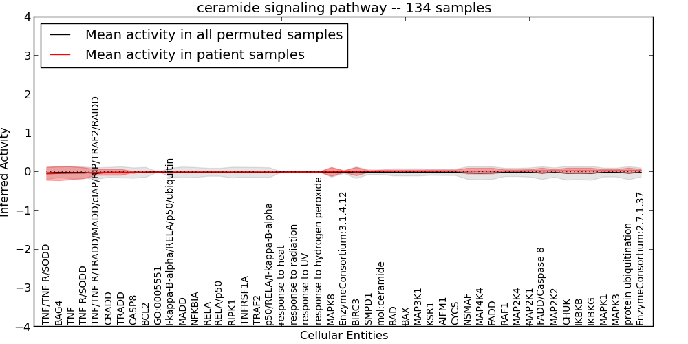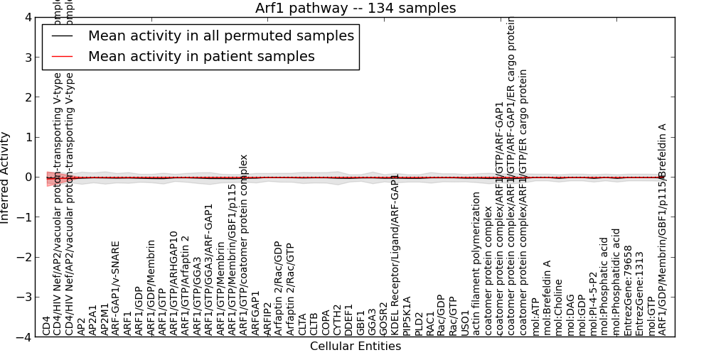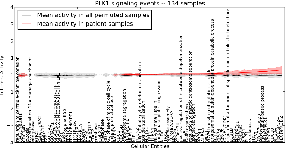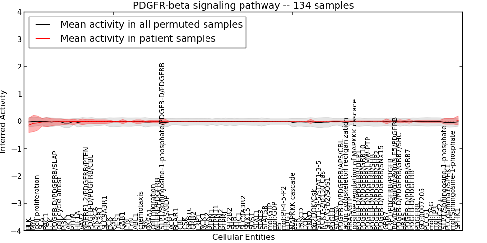Figure S131. Get High-res Image This plot shows pathway concept perturbations across all samples against a permutation model. The concepts along the x-axis are sorted by lowest to highest mean activity for the real patient samples. Mean inferred activities are plotted along the y-axis as a colored band showing the average level and one standard deviation range. Real samples are shown in red and permuted samples in black.