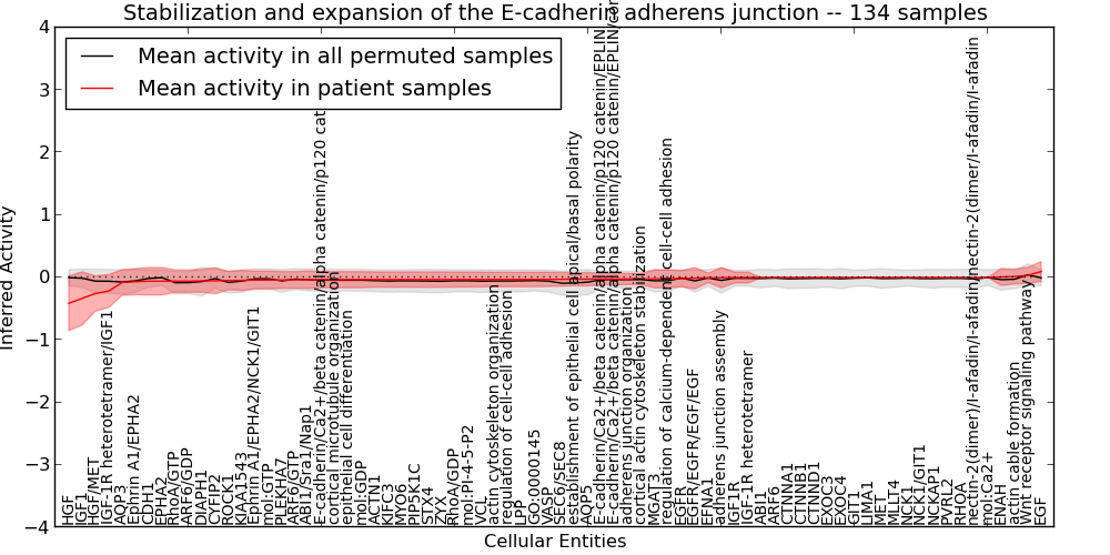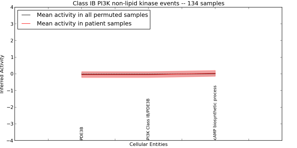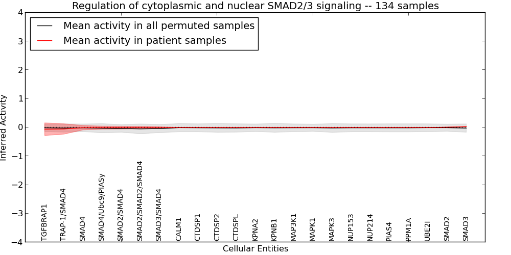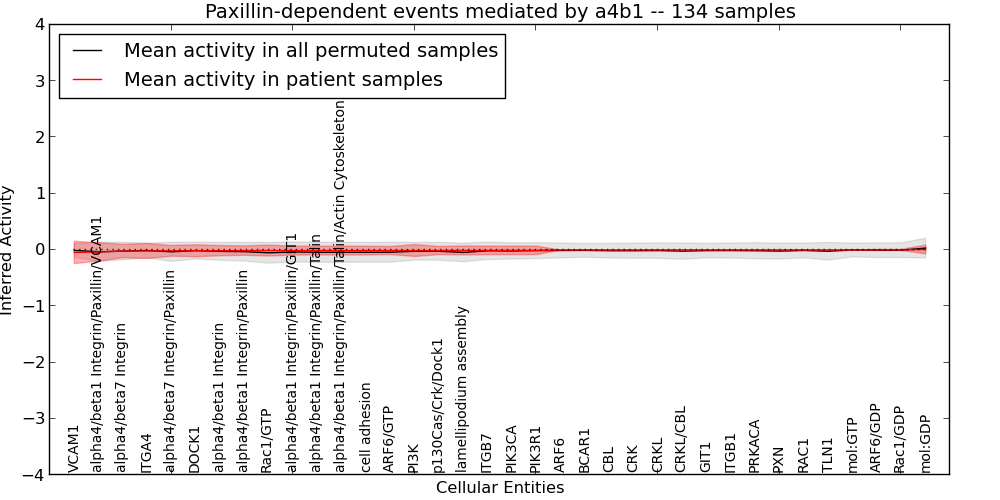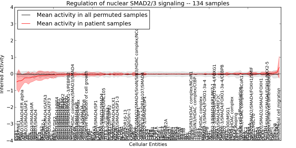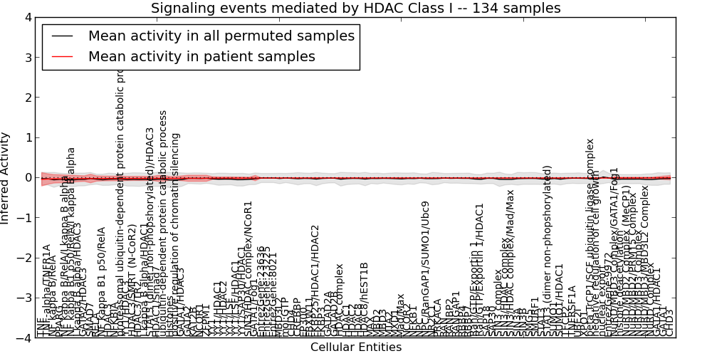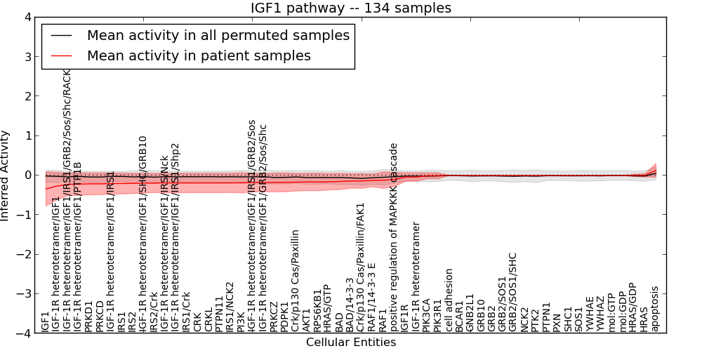 Figure S131. Get High-res Image This plot shows pathway concept perturbations across all samples against a permutation model. The concepts along the x-axis are sorted by lowest to highest mean activity for the real patient samples. Mean inferred activities are plotted along the y-axis as a colored band showing the average level and one standard deviation range. Real samples are shown in red and permuted samples in black.