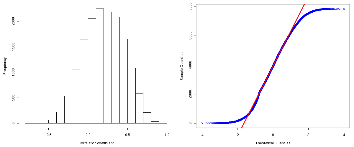 Figure 1. Summary figures. Left: histogram showing the distribution of the calculated correlations across samples for all Genes. Right: QQ plot of the calculated correlations across samples. The QQ plot is used to plot the quantiles of the calculated correlation coefficients against that derived from a normal distribution. Points deviating from the blue line indicate deviation from normality.