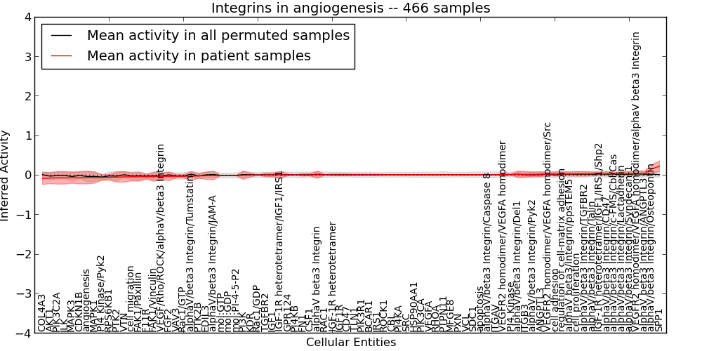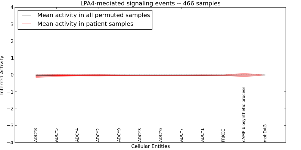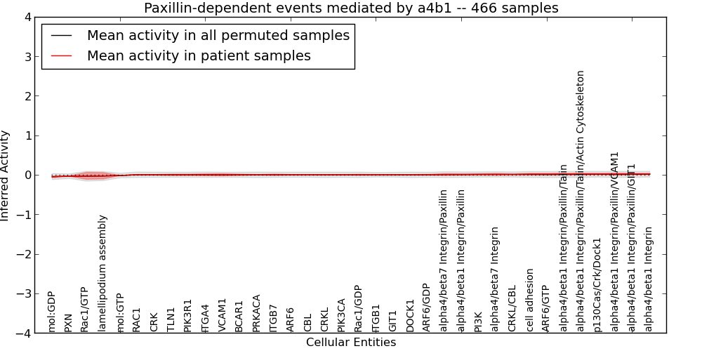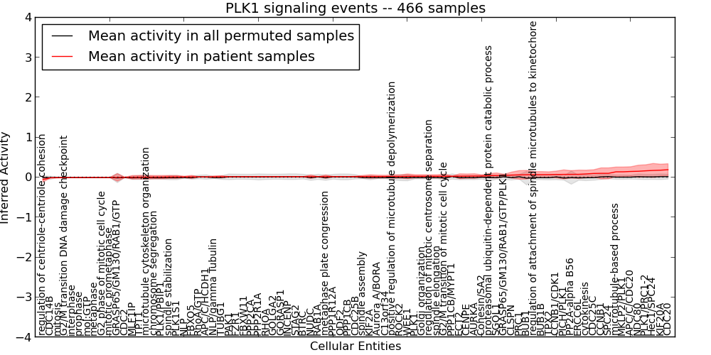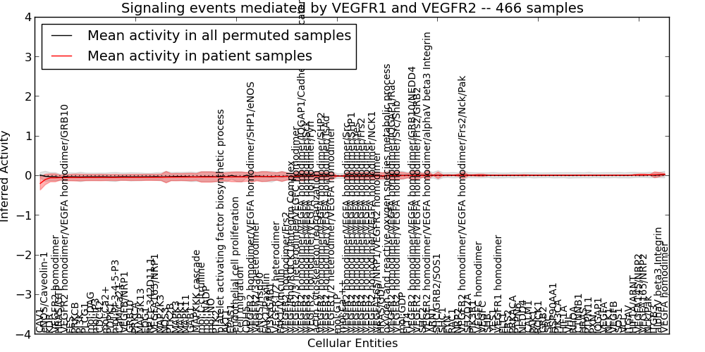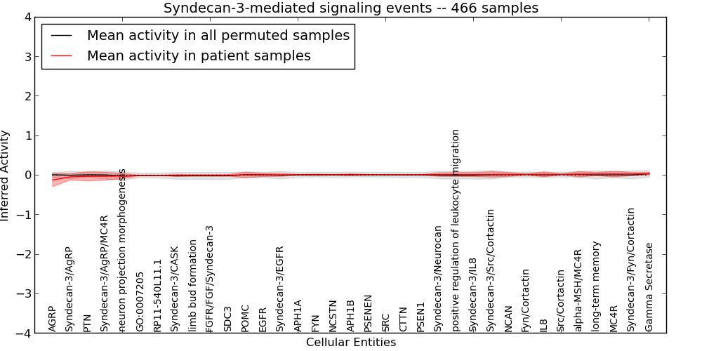 Figure S126. Get High-res Image This plot shows pathway concept perturbations across all samples against a permutation model. The concepts along the x-axis are sorted by lowest to highest mean activity for the real patient samples. Mean inferred activities are plotted along the y-axis as a colored band showing the average level and one standard deviation range. Real samples are shown in red and permuted samples in black.