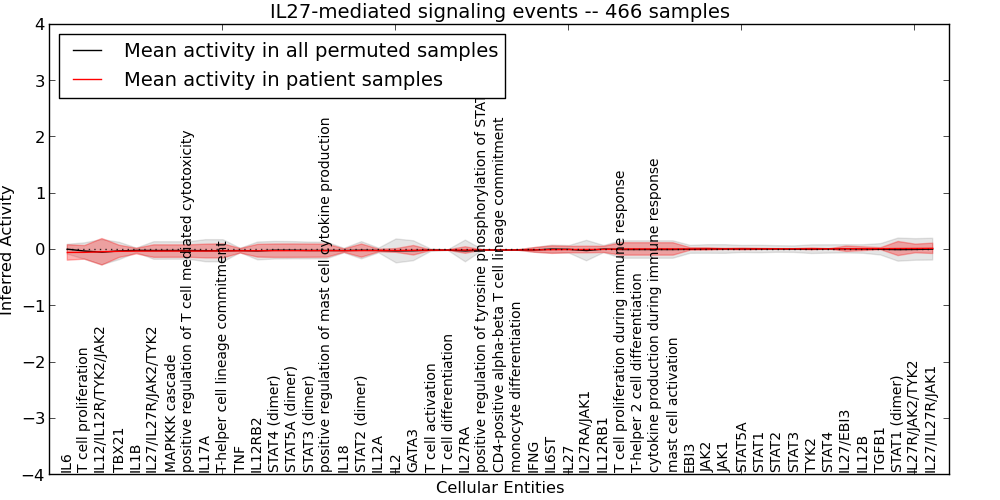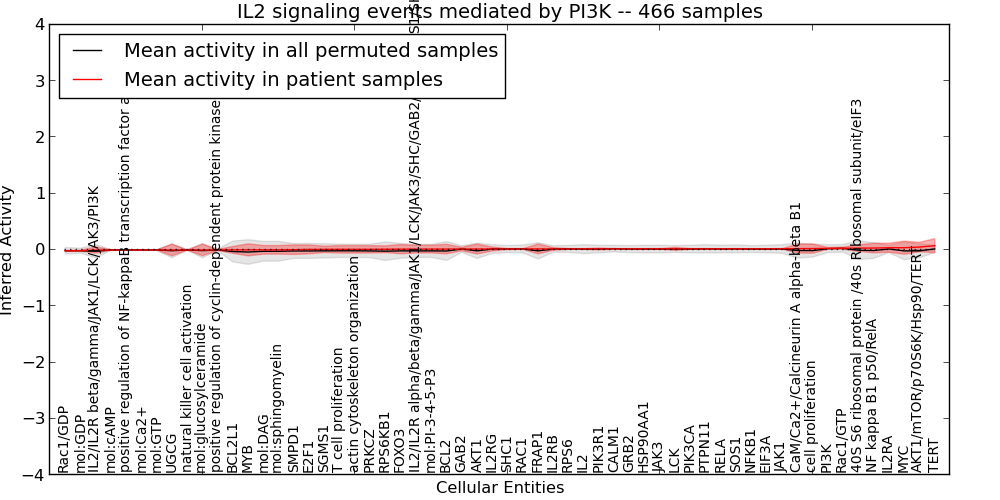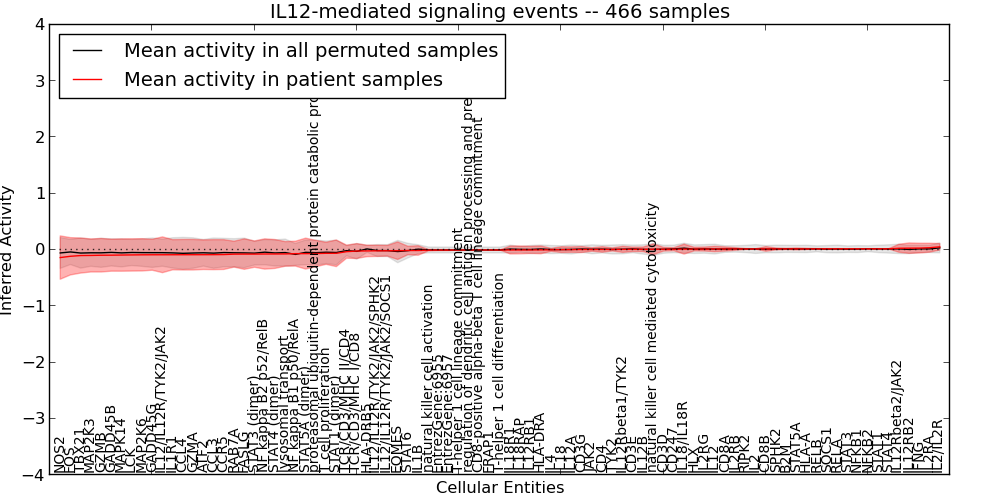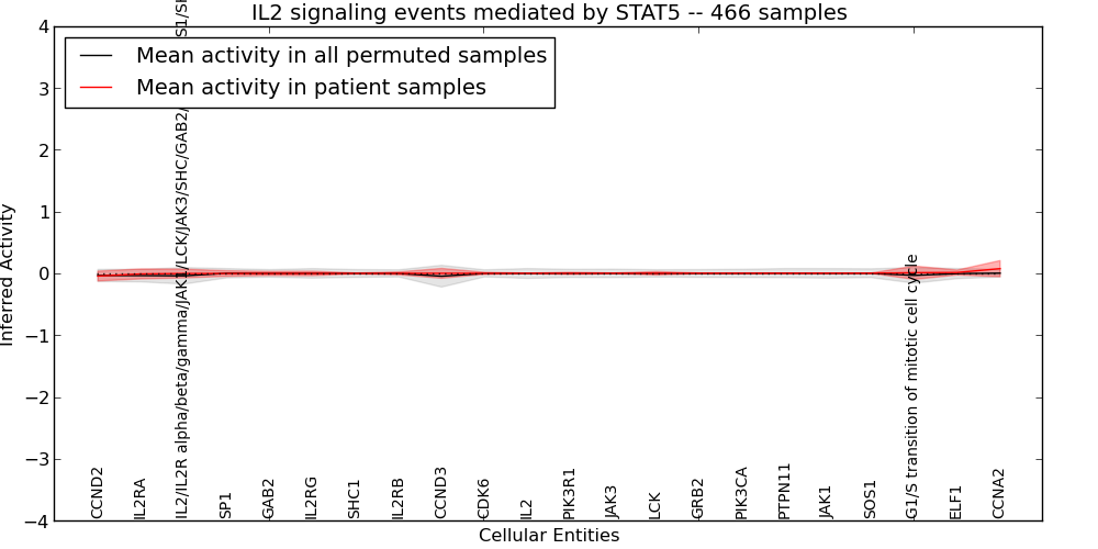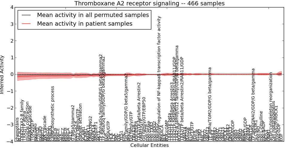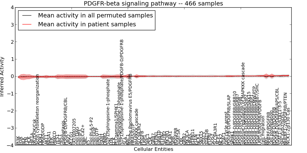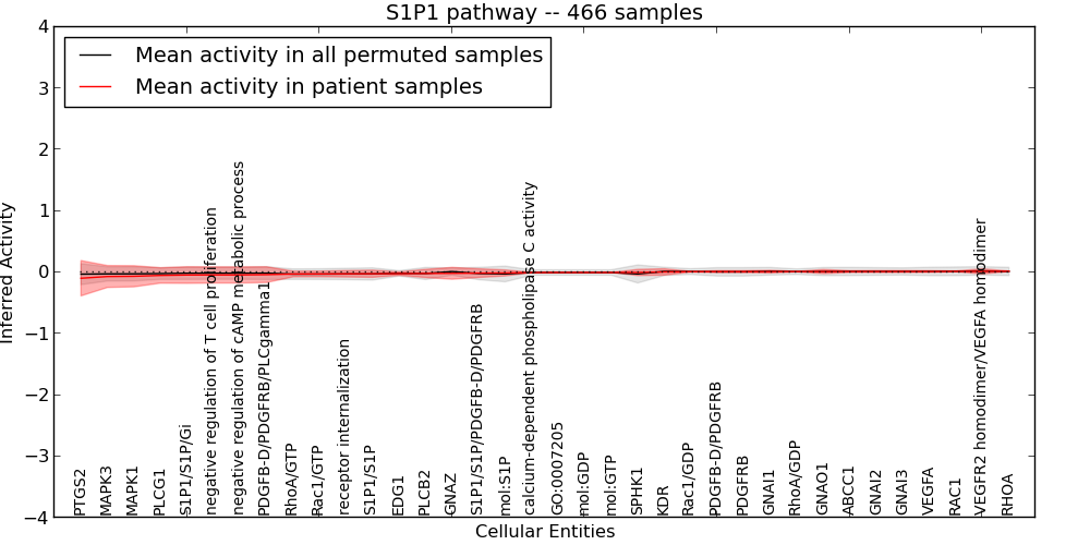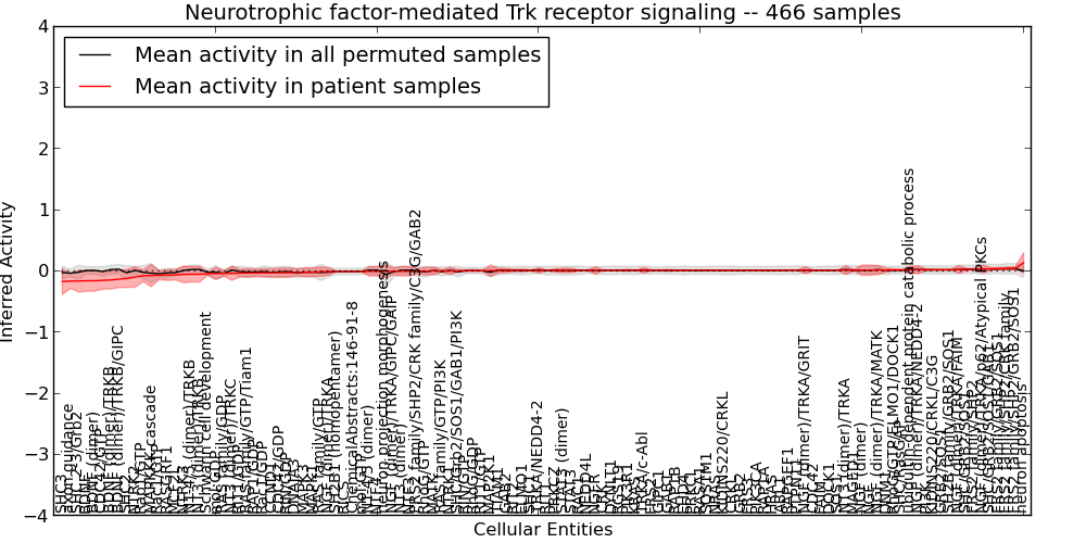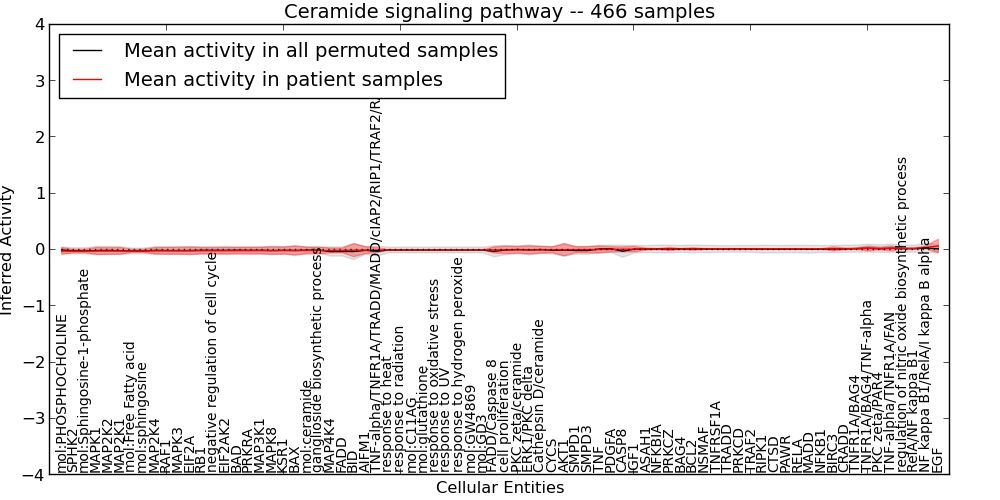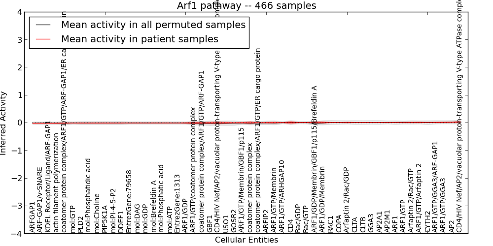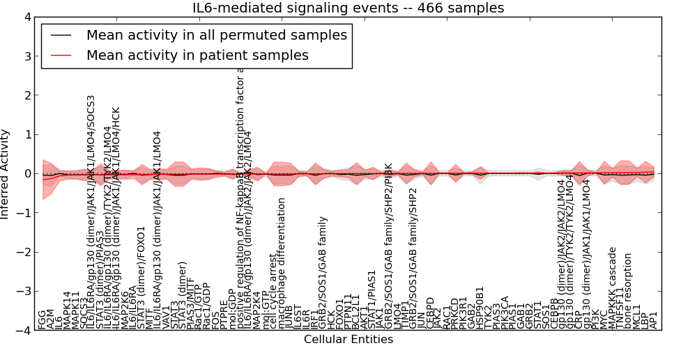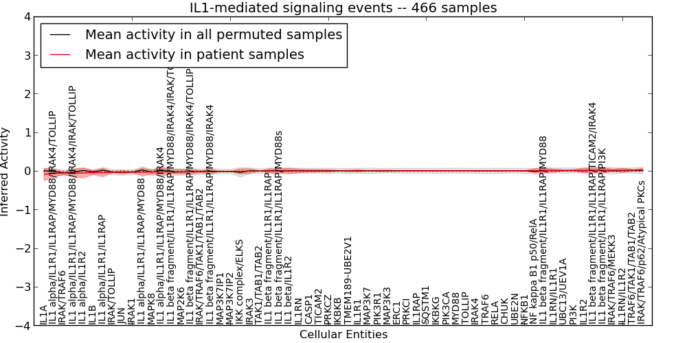 Figure S127. Get High-res Image This plot shows pathway concept perturbations across all samples against a permutation model. The concepts along the x-axis are sorted by lowest to highest mean activity for the real patient samples. Mean inferred activities are plotted along the y-axis as a colored band showing the average level and one standard deviation range. Real samples are shown in red and permuted samples in black.