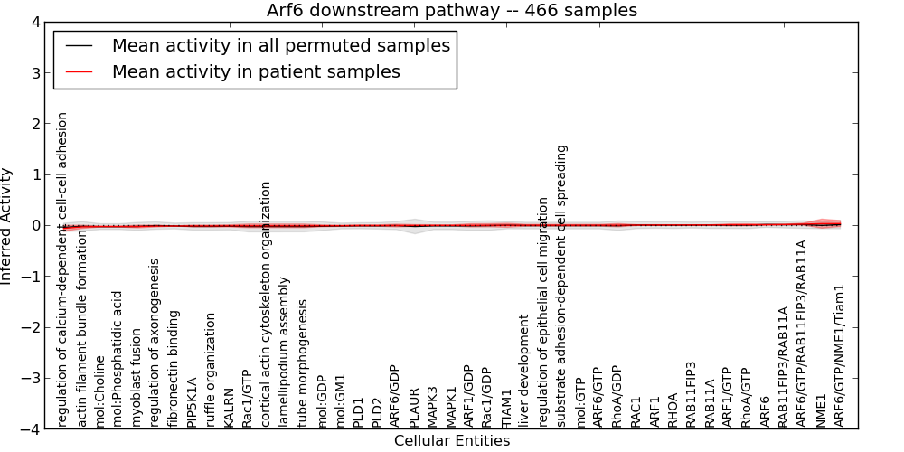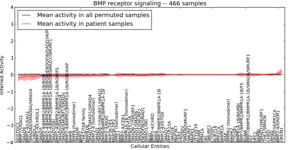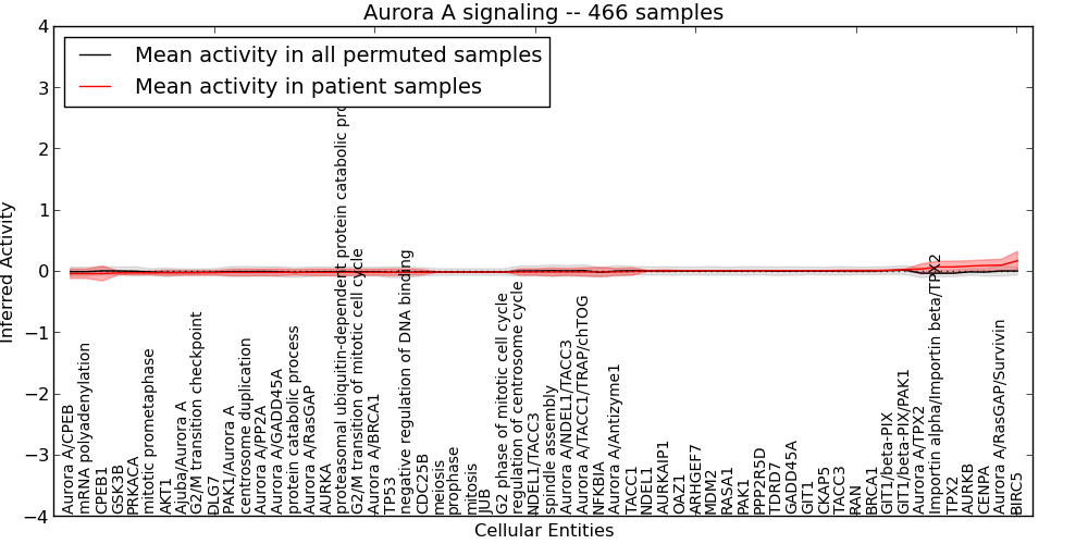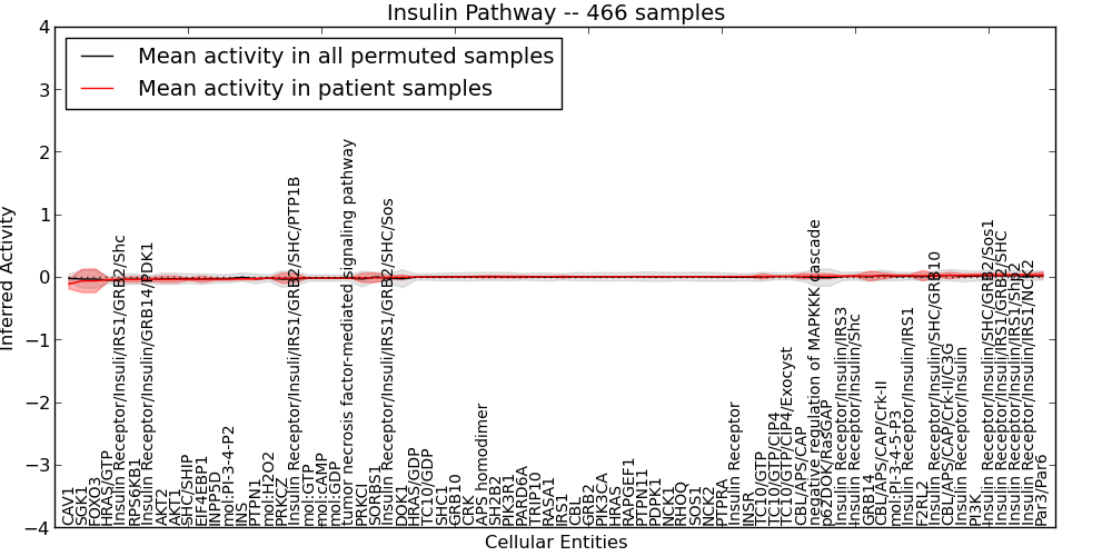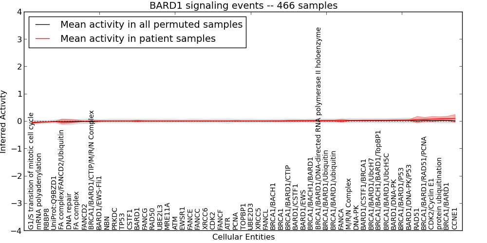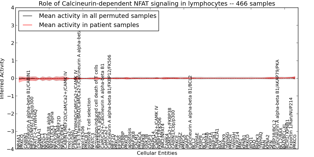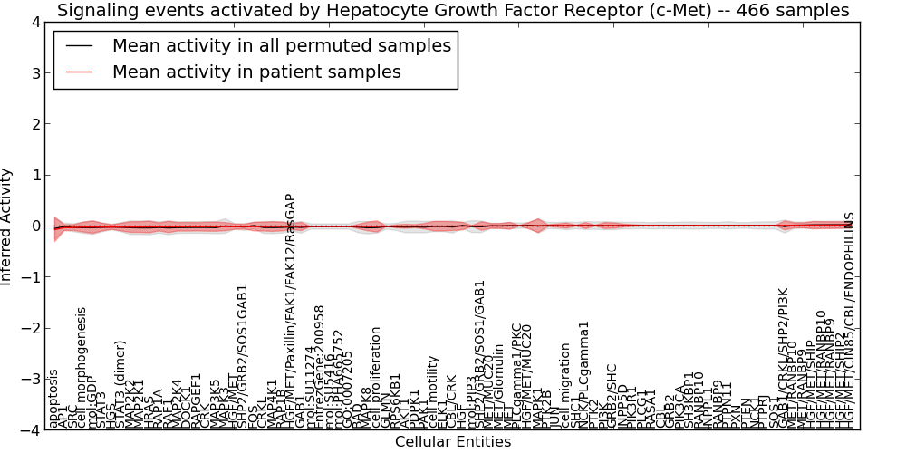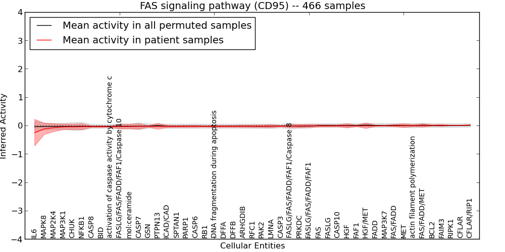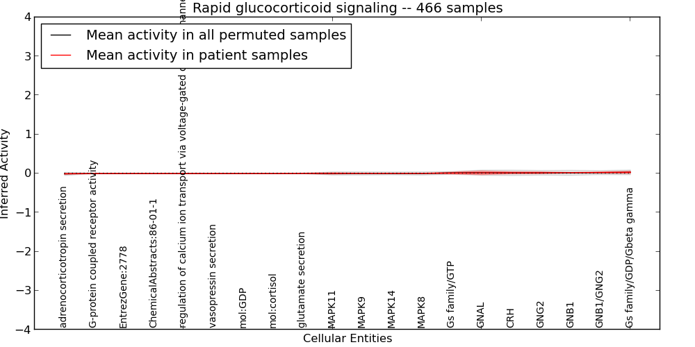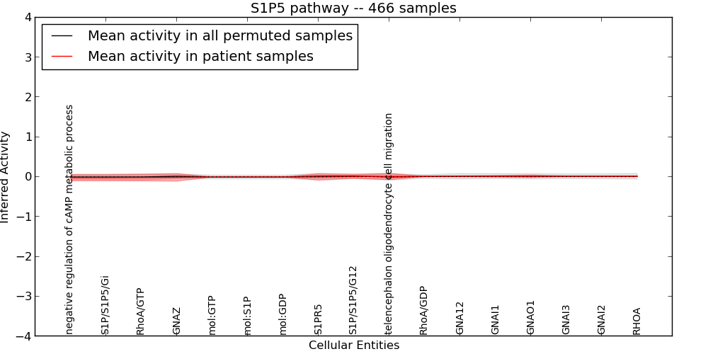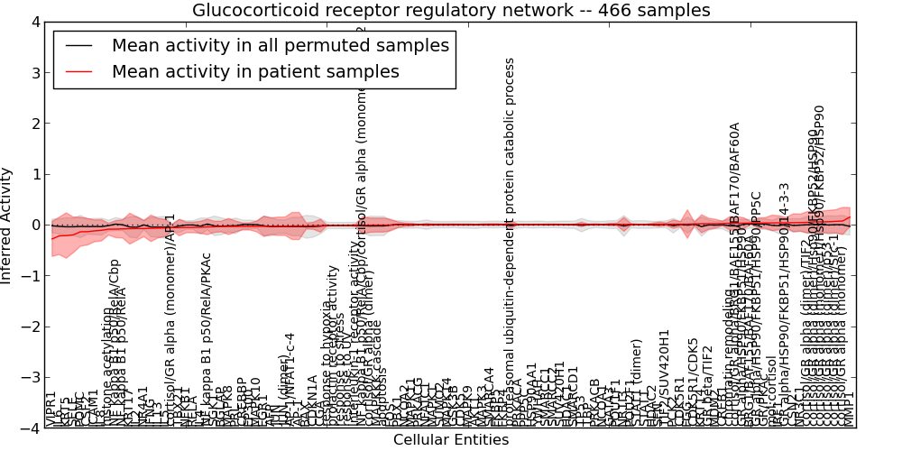 Figure S127. Get High-res Image This plot shows pathway concept perturbations across all samples against a permutation model. The concepts along the x-axis are sorted by lowest to highest mean activity for the real patient samples. Mean inferred activities are plotted along the y-axis as a colored band showing the average level and one standard deviation range. Real samples are shown in red and permuted samples in black.