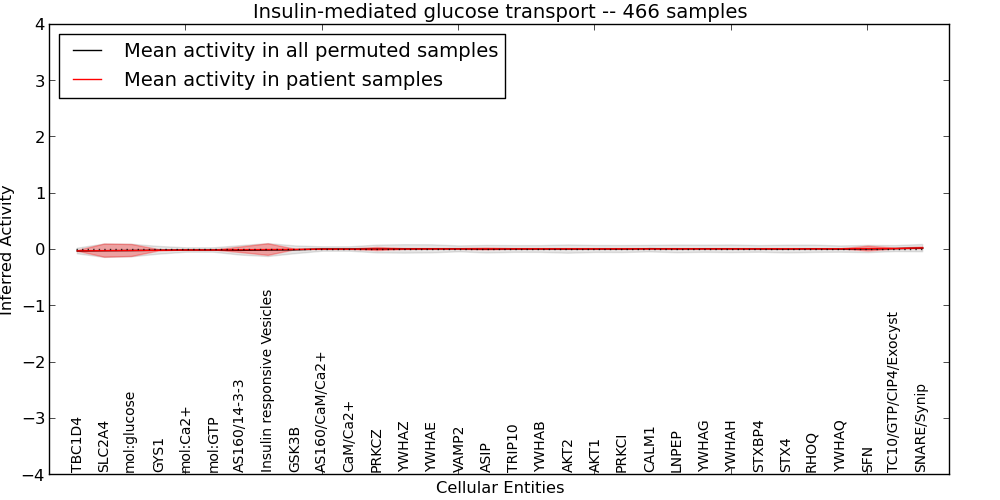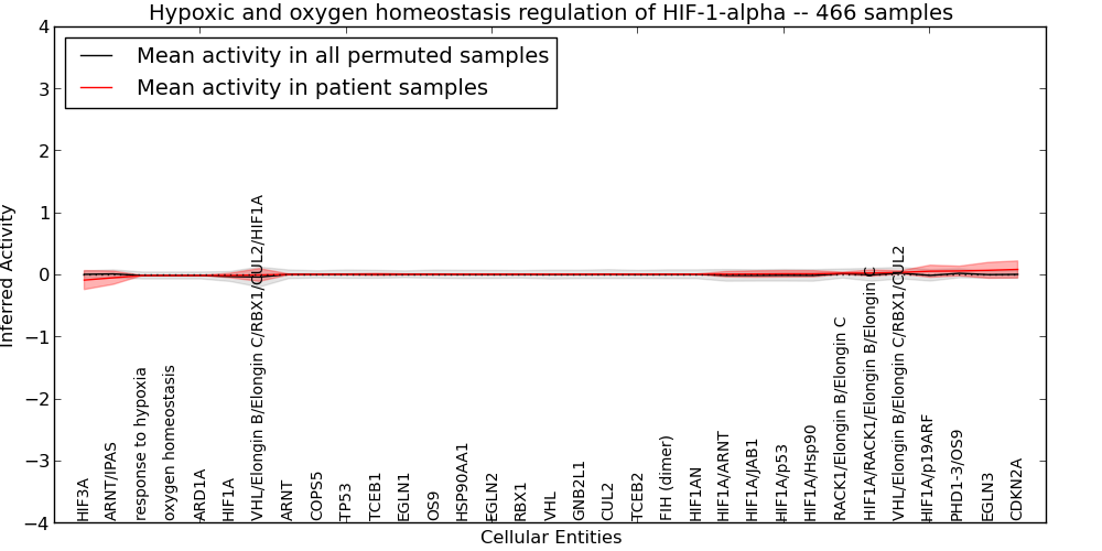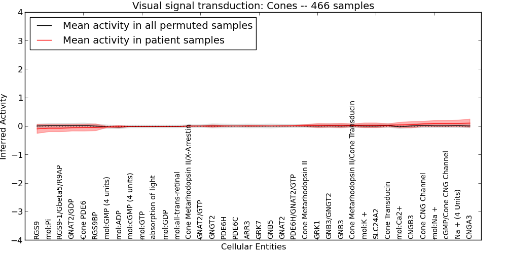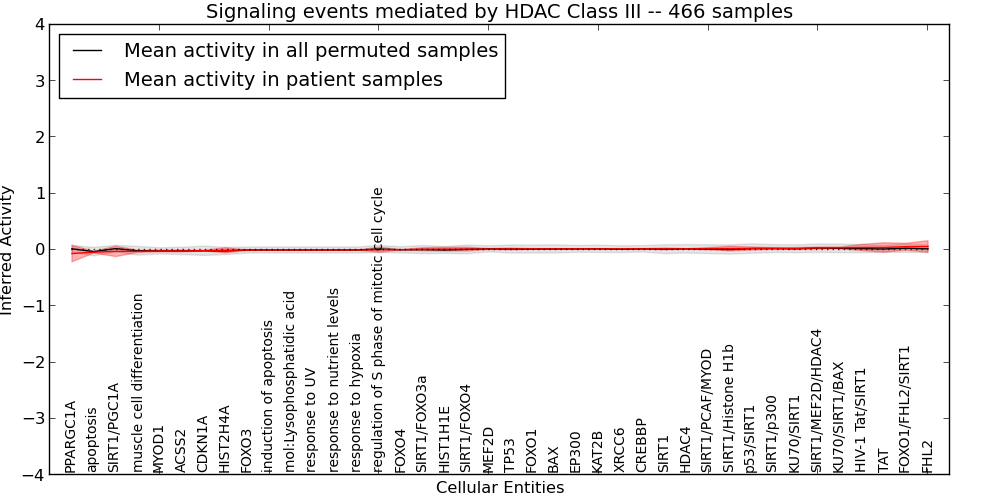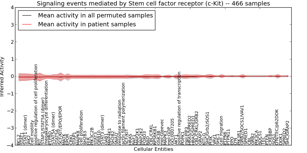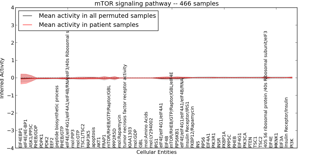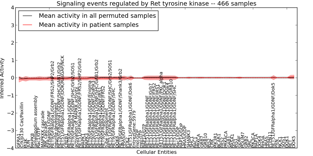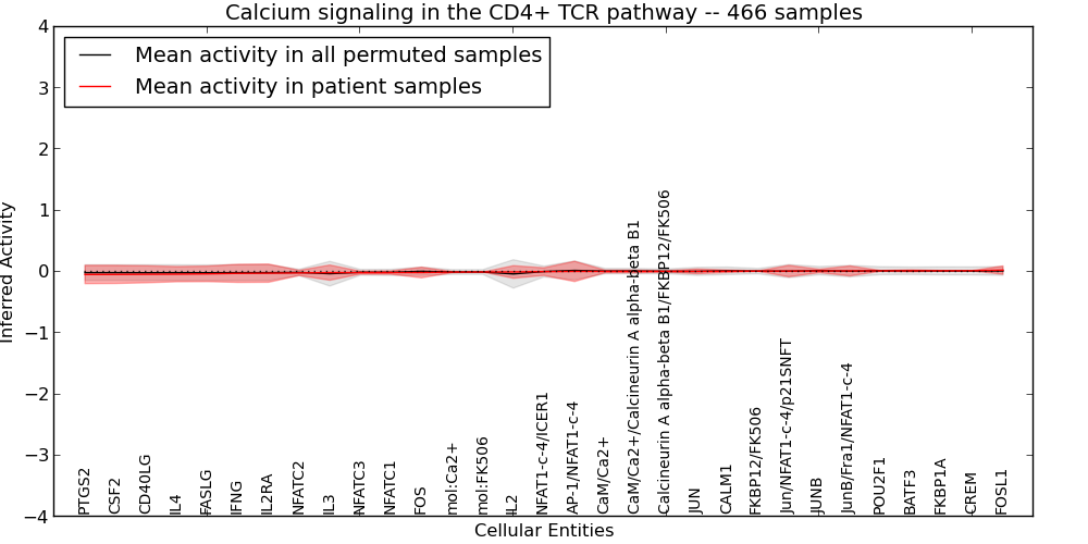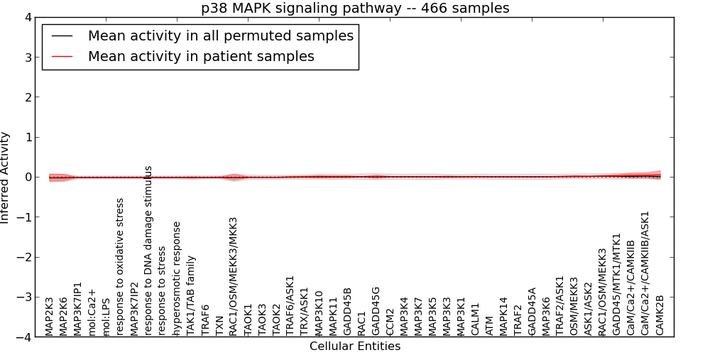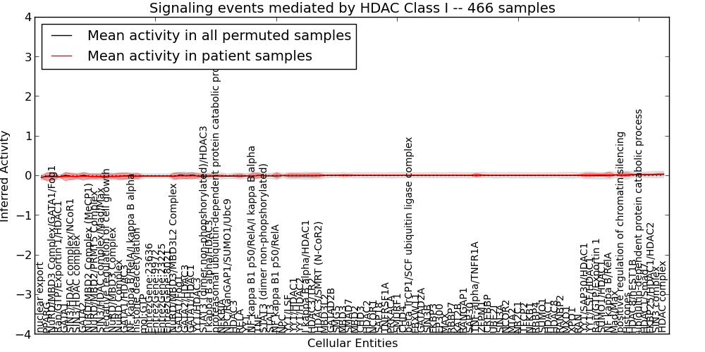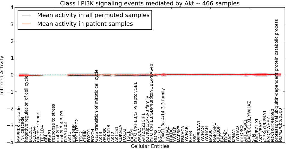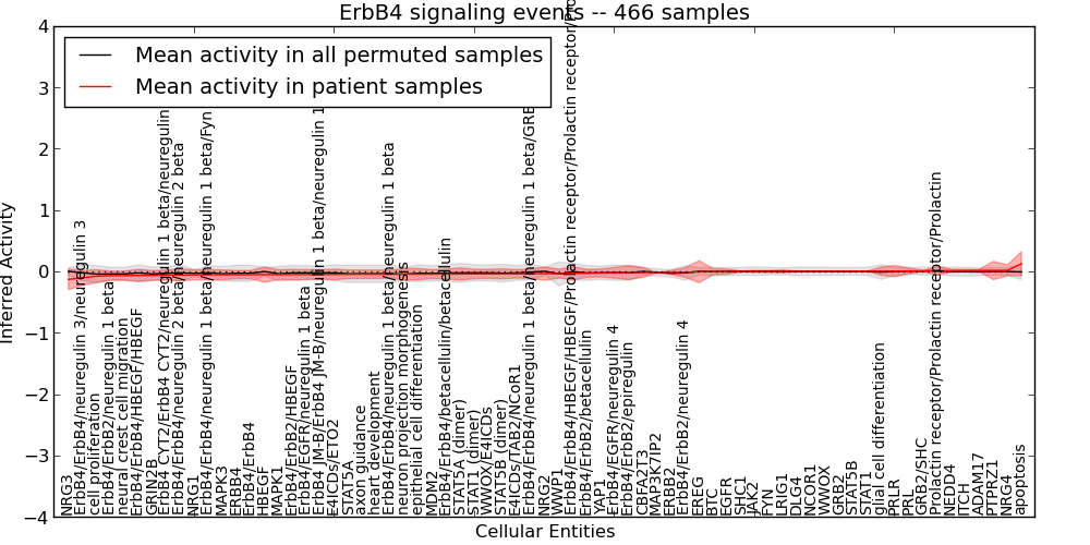 Figure S127. Get High-res Image This plot shows pathway concept perturbations across all samples against a permutation model. The concepts along the x-axis are sorted by lowest to highest mean activity for the real patient samples. Mean inferred activities are plotted along the y-axis as a colored band showing the average level and one standard deviation range. Real samples are shown in red and permuted samples in black.