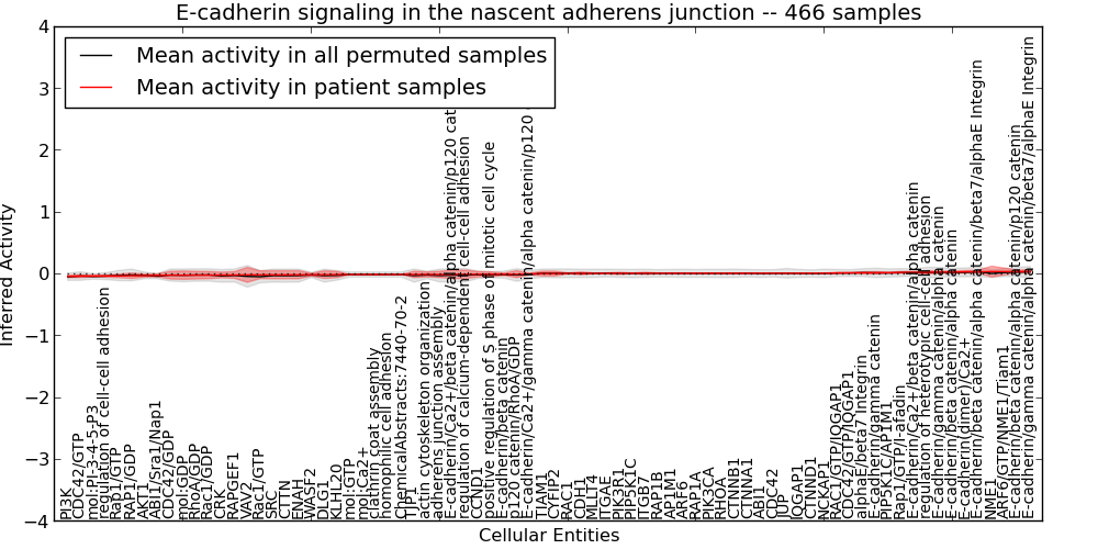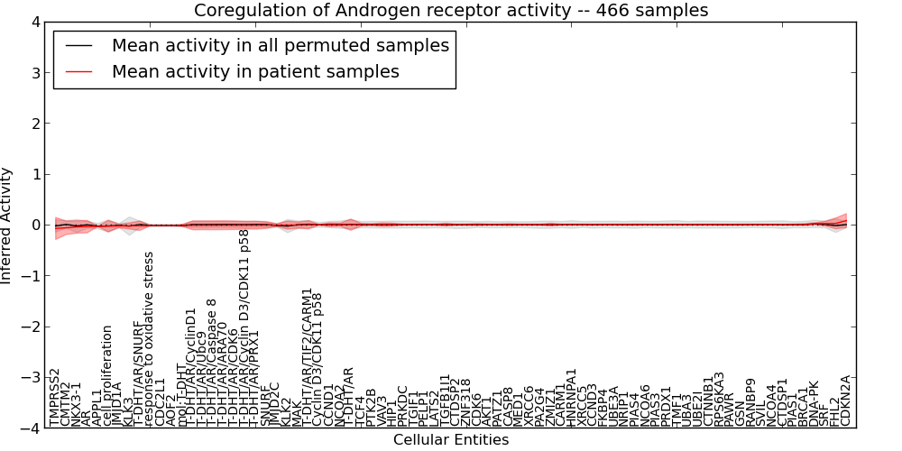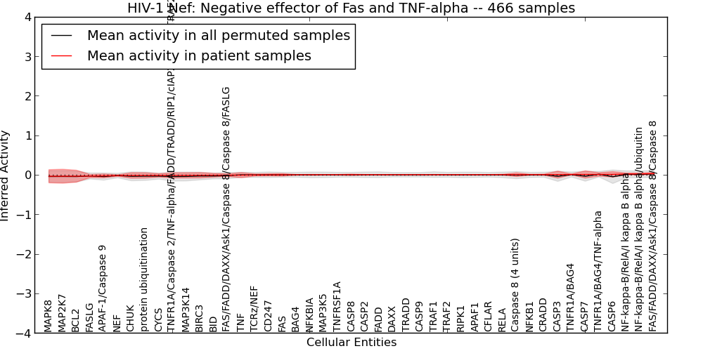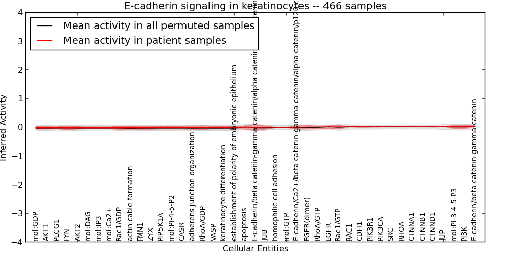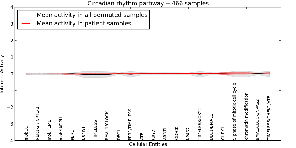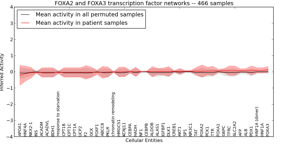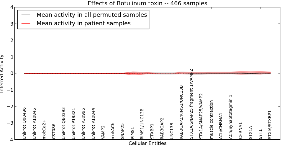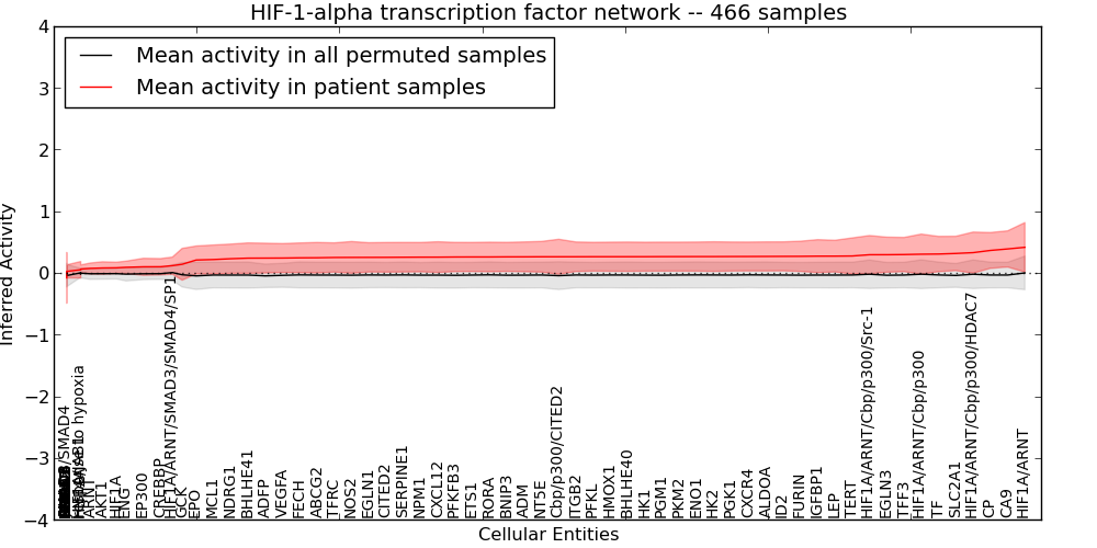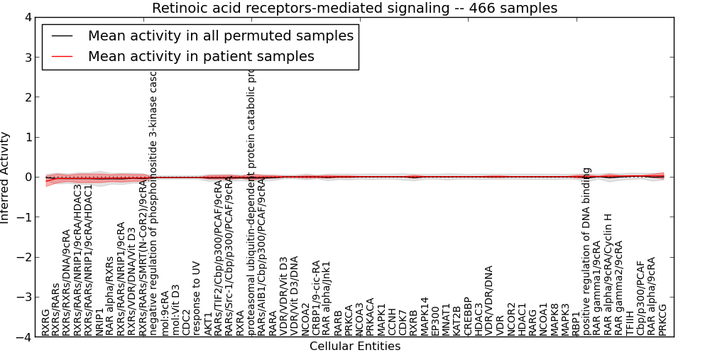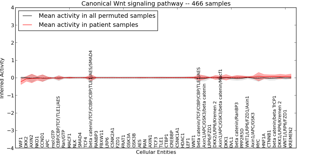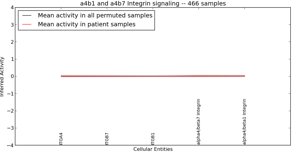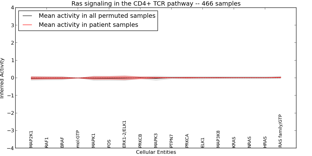Figure S127. Get High-res Image This plot shows pathway concept perturbations across all samples against a permutation model. The concepts along the x-axis are sorted by lowest to highest mean activity for the real patient samples. Mean inferred activities are plotted along the y-axis as a colored band showing the average level and one standard deviation range. Real samples are shown in red and permuted samples in black.