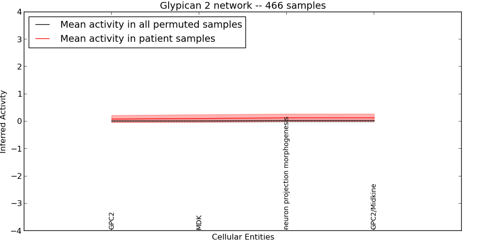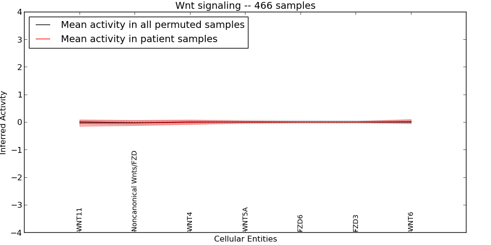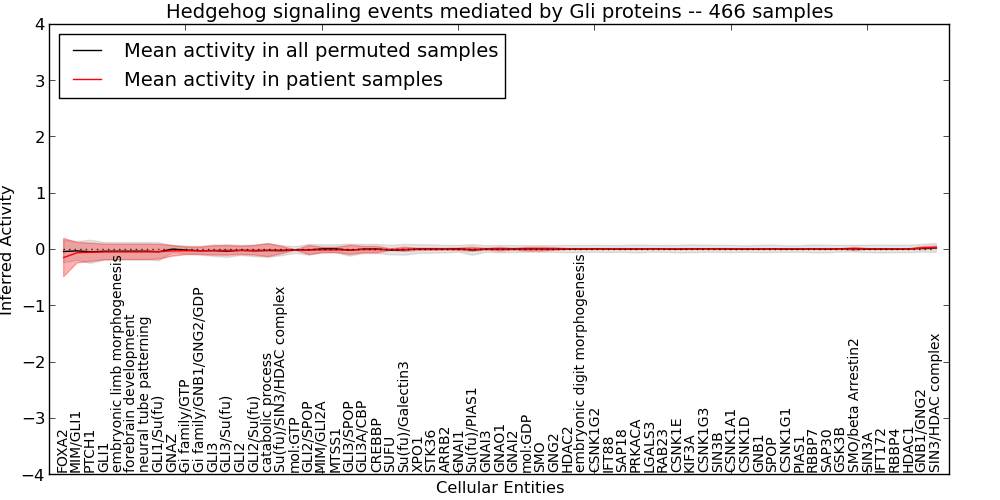 Figure S128. Get High-res Image This plot shows pathway concept perturbations across all samples against a permutation model. The concepts along the x-axis are sorted by lowest to highest mean activity for the real patient samples. Mean inferred activities are plotted along the y-axis as a colored band showing the average level and one standard deviation range. Real samples are shown in red and permuted samples in black.