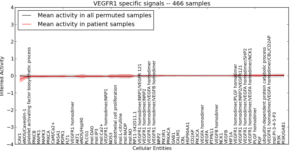 Figure S131. Get High-res Image This plot shows pathway concept perturbations across all samples against a permutation model. The concepts along the x-axis are sorted by lowest to highest mean activity for the real patient samples. Mean inferred activities are plotted along the y-axis as a colored band showing the average level and one standard deviation range. Real samples are shown in red and permuted samples in black.