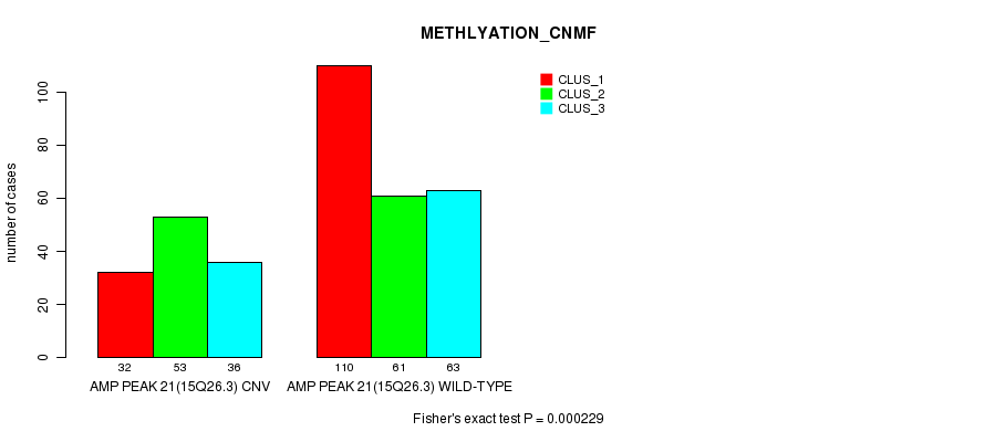 Amp Peak 21(15q26.3) cnvs correlated to 'CN_CNMF', 'METHLYATION_CNMF', 'MRNASEQ_CNMF', and 'MRNASEQ_CHIERARCHICAL'.