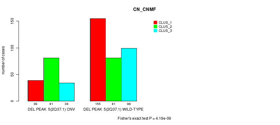 Del Peak 5(2q37.1) cnvs correlated to 'CN_CNMF', 'METHLYATION_CNMF', 'MRNASEQ_CNMF', 'MRNASEQ_CHIERARCHICAL', 'MIRSEQ_CNMF', 'MIRSEQ_MATURE_CNMF', and 'MIRSEQ_MATURE_CHIERARCHICAL'.