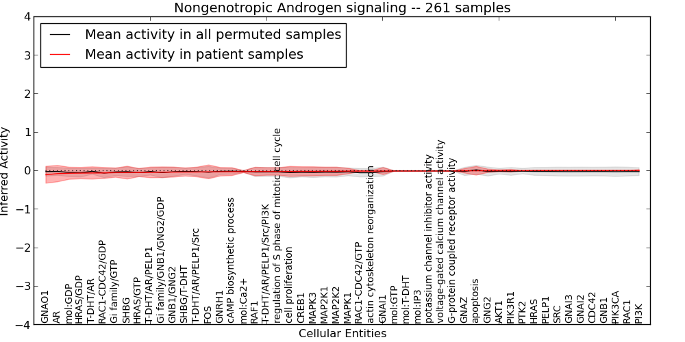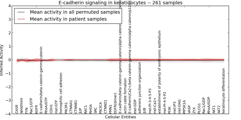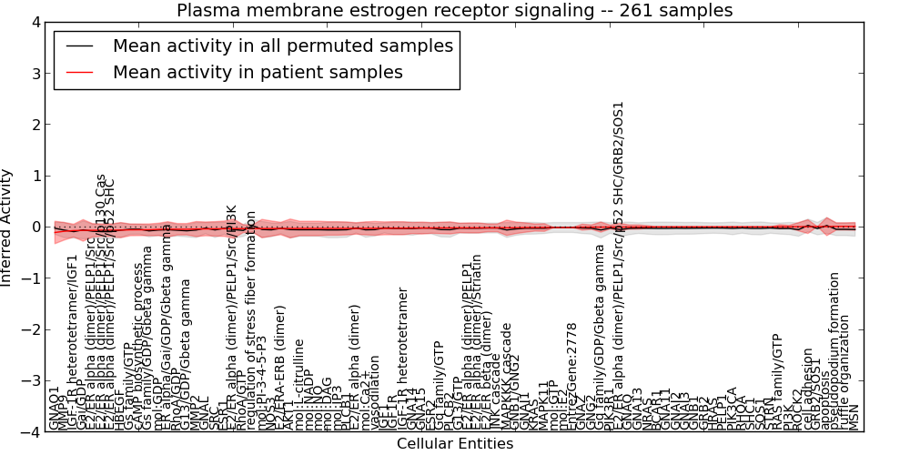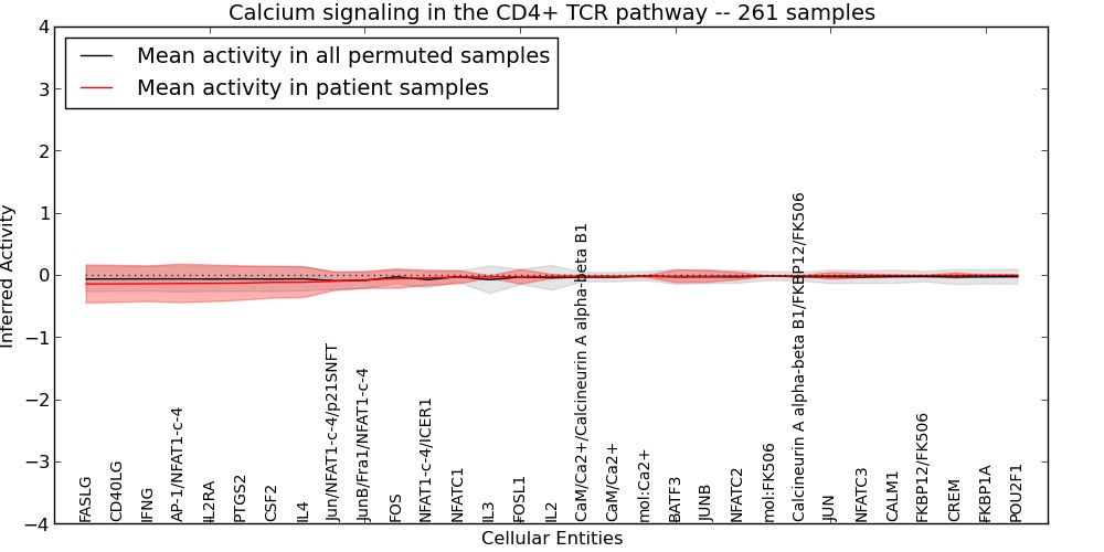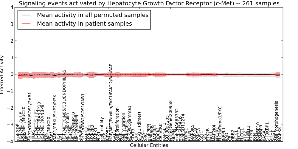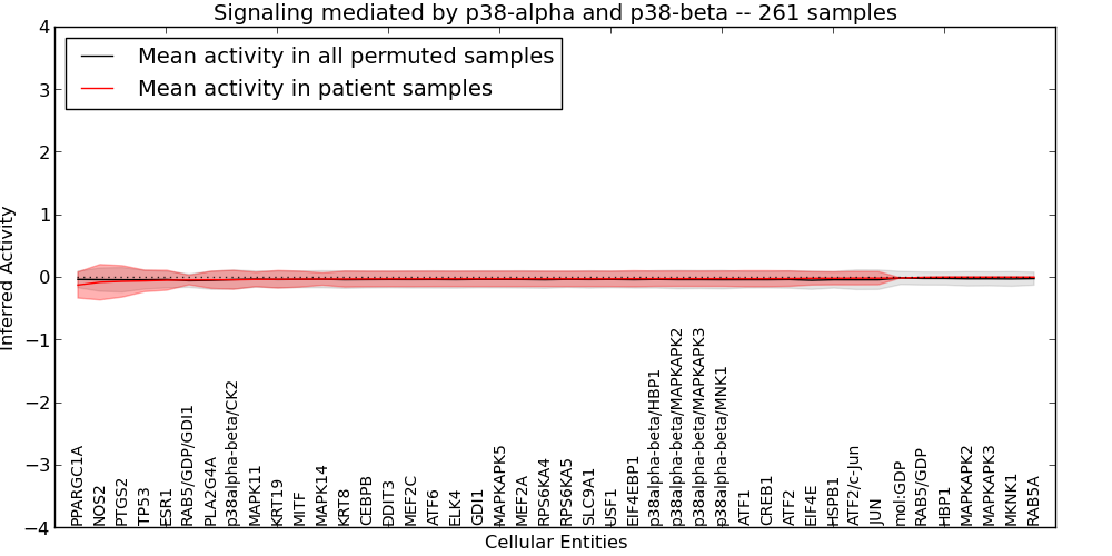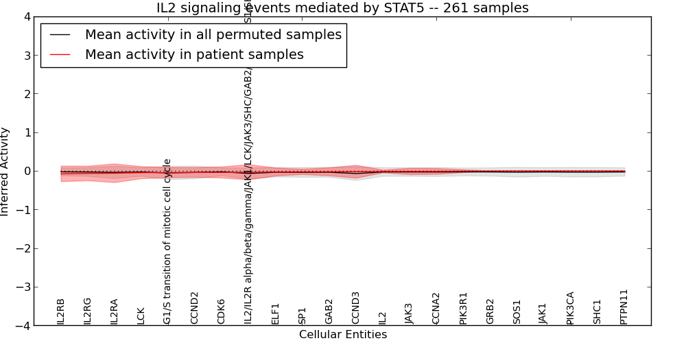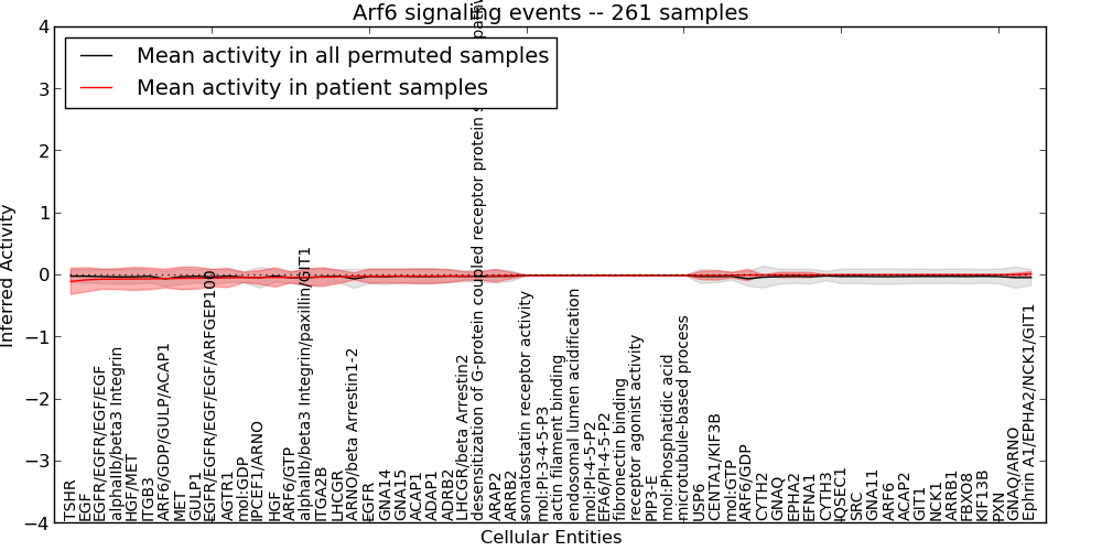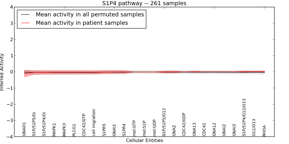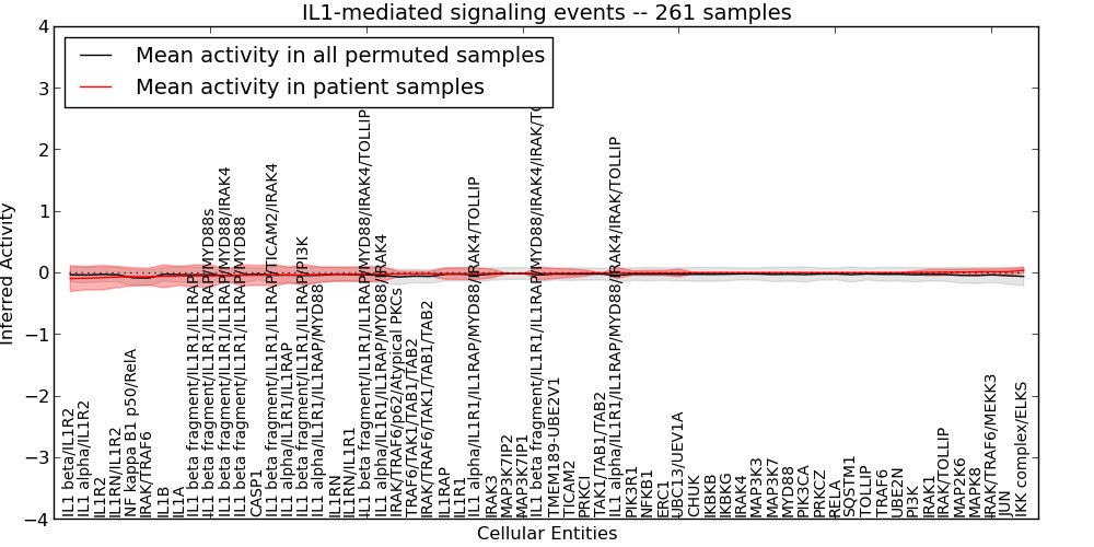 Figure S131.  Get High-res Image This plot shows pathway concept perturbations across all samples against a permutation model. The concepts along the x-axis are sorted by lowest to highest mean activity for the real patient samples. Mean inferred activities are plotted along the y-axis as a colored band showing the average level and one standard deviation range. Real samples are shown in red and permuted samples in black.
