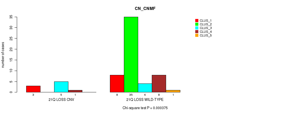 21q loss cnv correlated to 'CN_CNMF', 'METHLYATION_CNMF', and 'MRNASEQ_CHIERARCHICAL'.