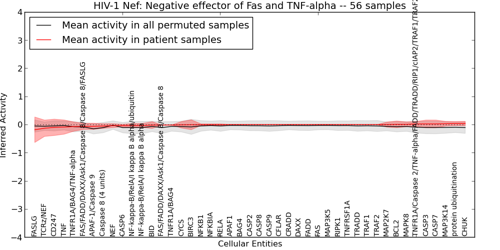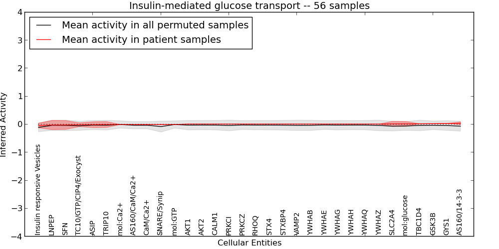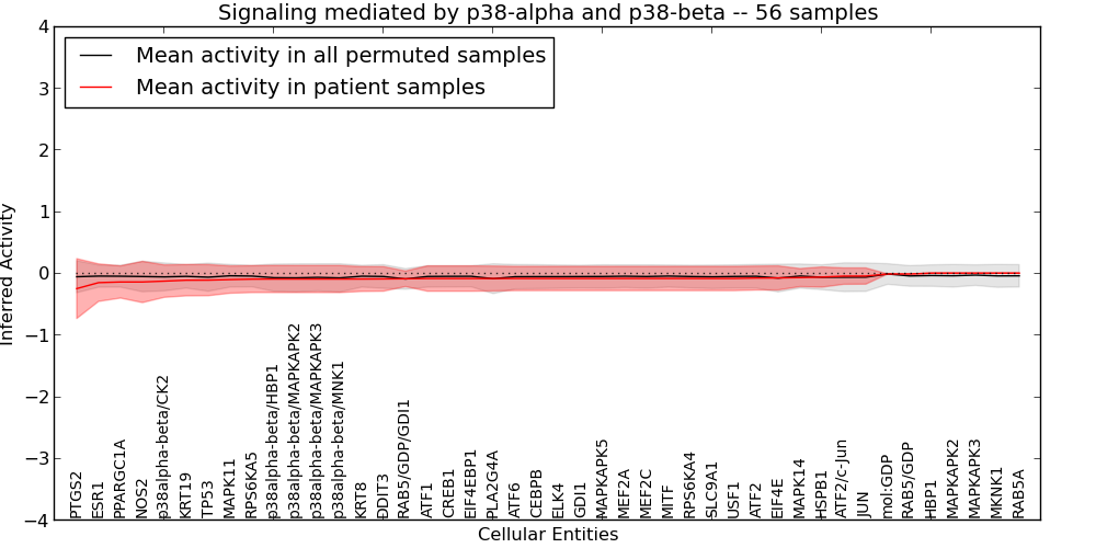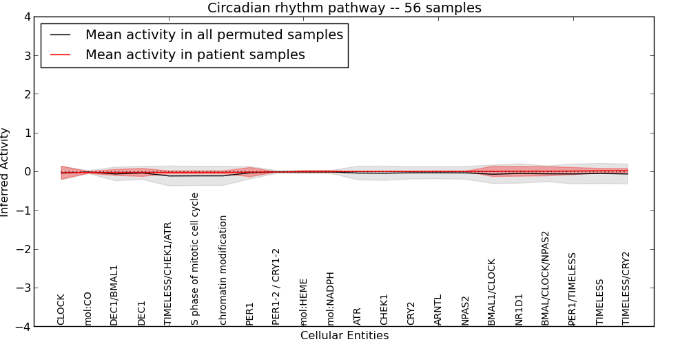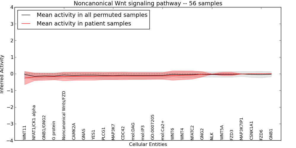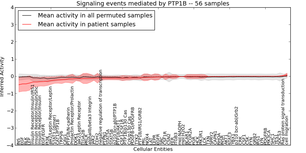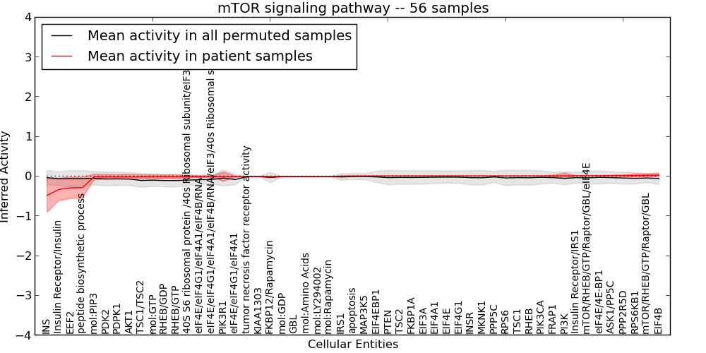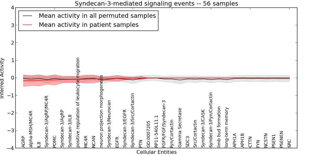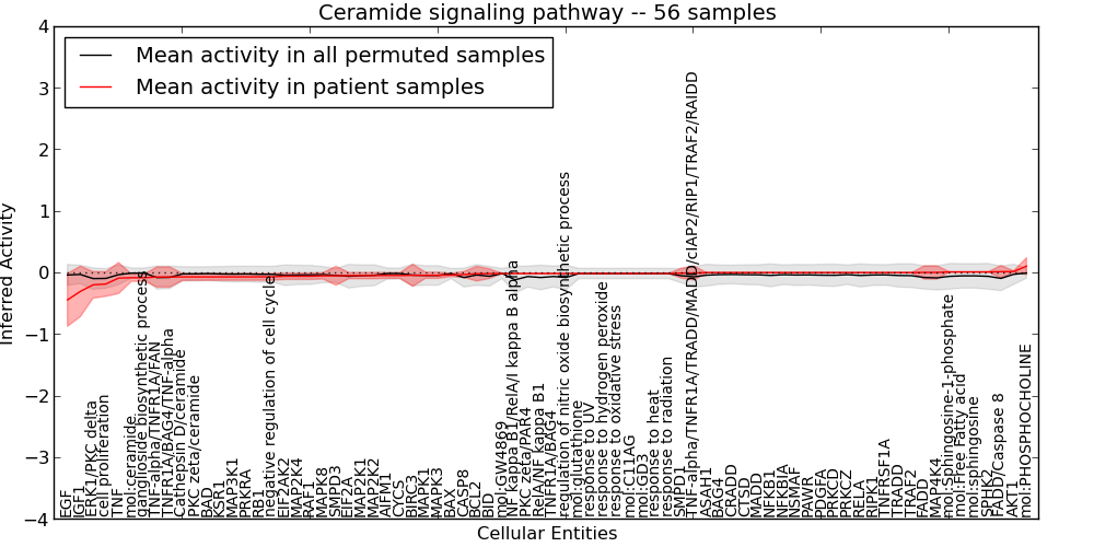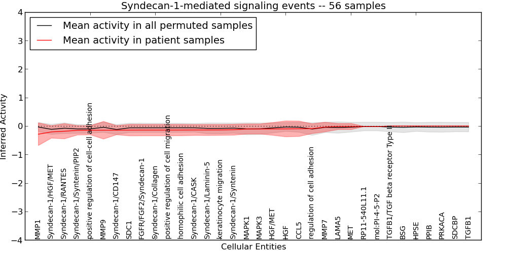 Figure S131. Get High-res Image This plot shows pathway concept perturbations across all samples against a permutation model. The concepts along the x-axis are sorted by lowest to highest mean activity for the real patient samples. Mean inferred activities are plotted along the y-axis as a colored band showing the average level and one standard deviation range. Real samples are shown in red and permuted samples in black.