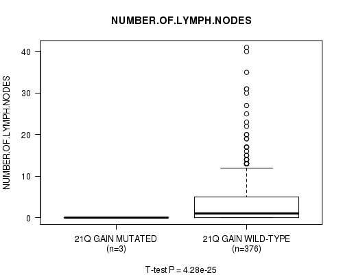 21Q GAIN MUTATION ANALYSIS cnv correlated to 'NUMBER.OF.LYMPH.NODES'.