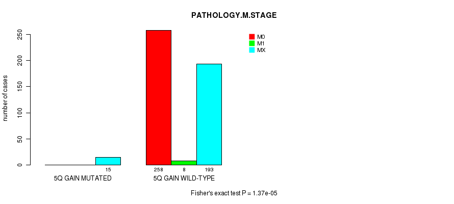 5Q GAIN MUTATION ANALYSIS cnv correlated to 'NEOPLASM.DISEASESTAGE', 'PATHOLOGY.M.STAGE', and 'NUMBER.OF.LYMPH.NODES'.