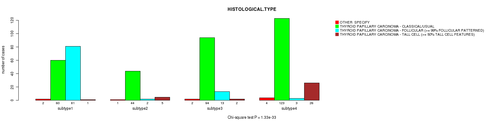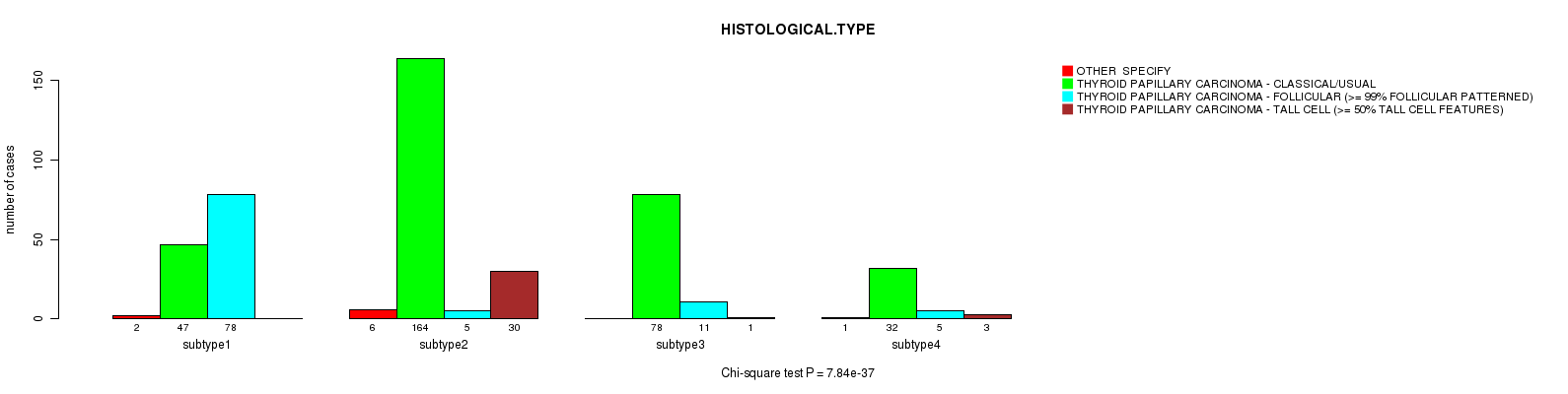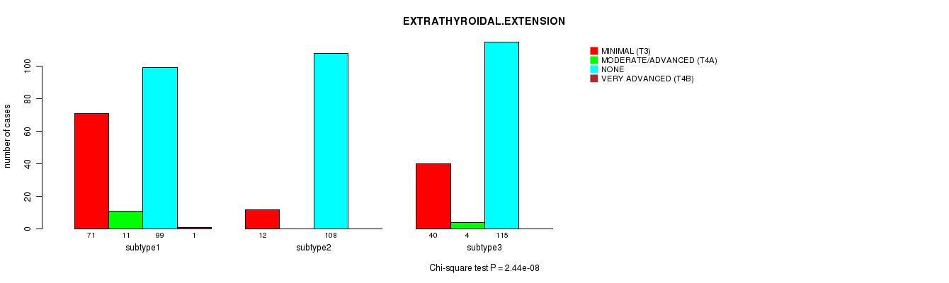 Consensus hierarchical clustering analysis on sequencing-based mRNA expression data identified 4 subtypes that correlate to 'NEOPLASM.DISEASESTAGE', 'PATHOLOGY.T.STAGE', 'PATHOLOGY.N.STAGE', 'HISTOLOGICAL.TYPE', 'EXTRATHYROIDAL.EXTENSION', and 'NUMBER.OF.LYMPH.NODES'.