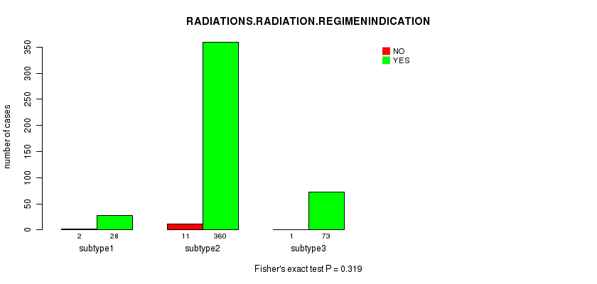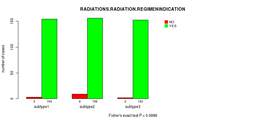 Figure S144. Get High-res Image Clustering Approach #10: 'MIRseq Mature cHierClus subtypes' versus Clinical Feature #9: 'RADIATIONS.RADIATION.REGIMENINDICATION'