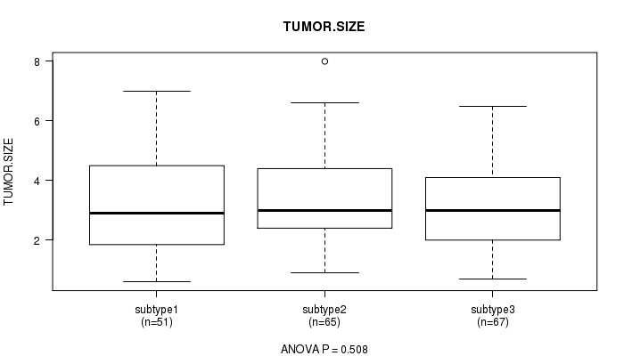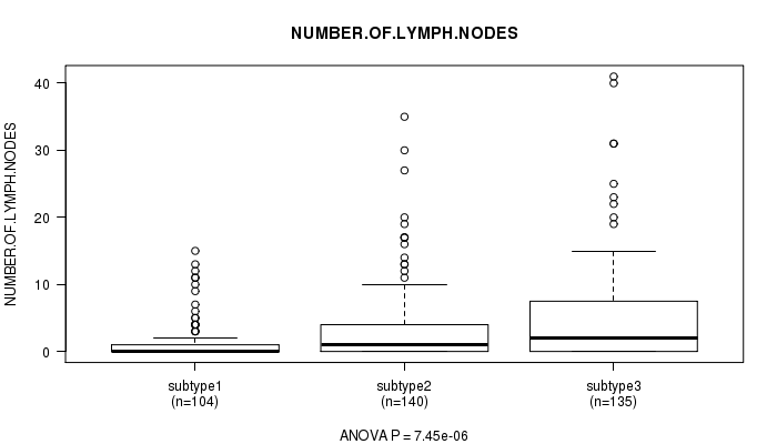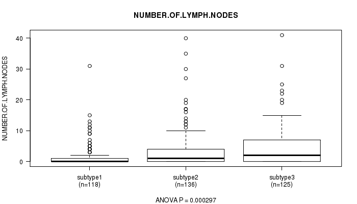For continuous numerical clinical features, one-way analysis of variance (Howell 2002) was applied to compare the clinical values between tumor subtypes using 'anova' function in R
