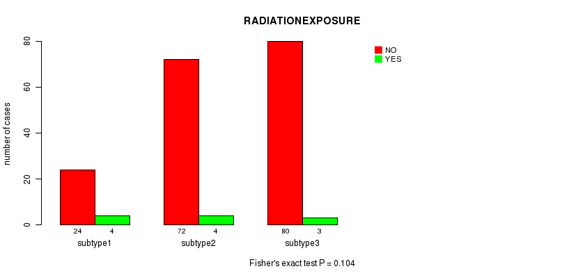 Figure S145. Get High-res Image Clustering Approach #10: 'MIRseq Mature cHierClus subtypes' versus Clinical Feature #10: 'RADIATIONEXPOSURE'