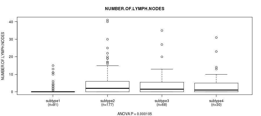 Table S158. Clustering Approach #10: 'MIRseq Mature cHierClus subtypes' versus Clinical Feature #13: 'NUMBER.OF.LYMPH.NODES'