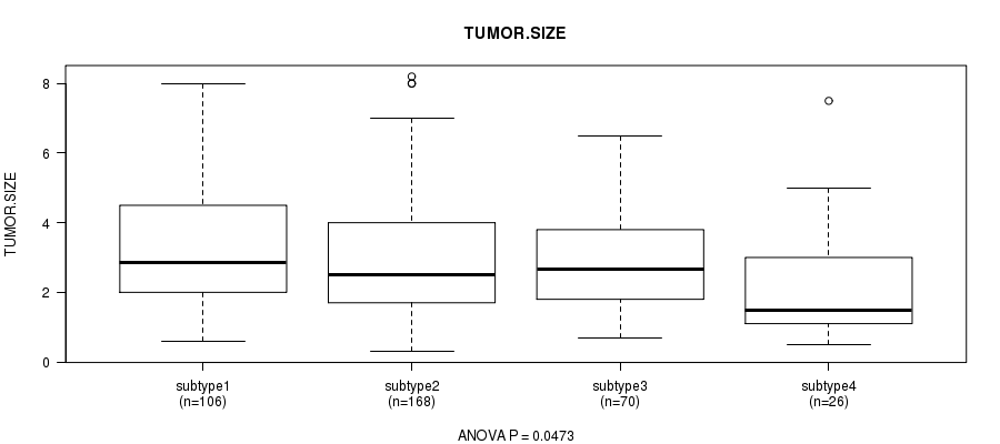 Table S160. Clustering Approach #10: 'MIRseq Mature cHierClus subtypes' versus Clinical Feature #15: 'TUMOR.SIZE'