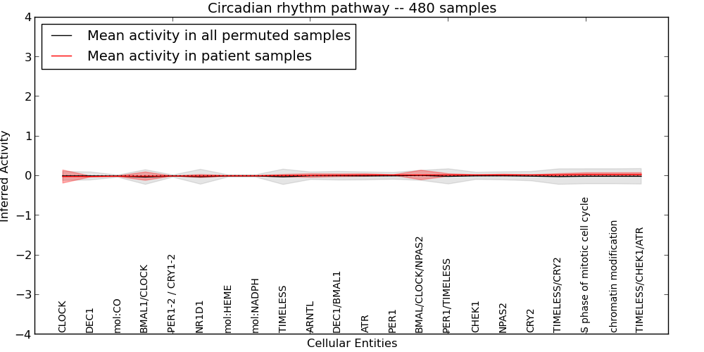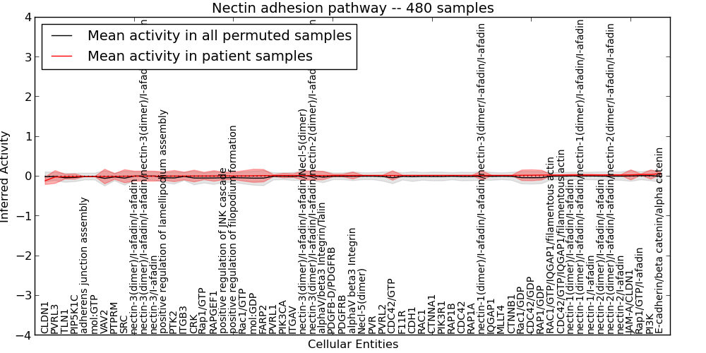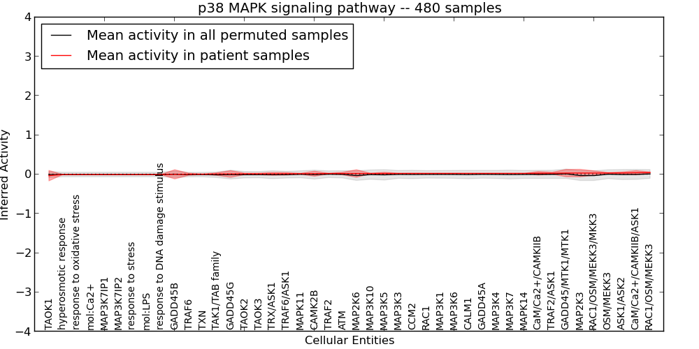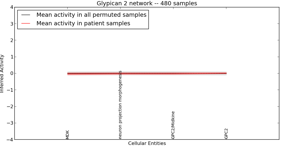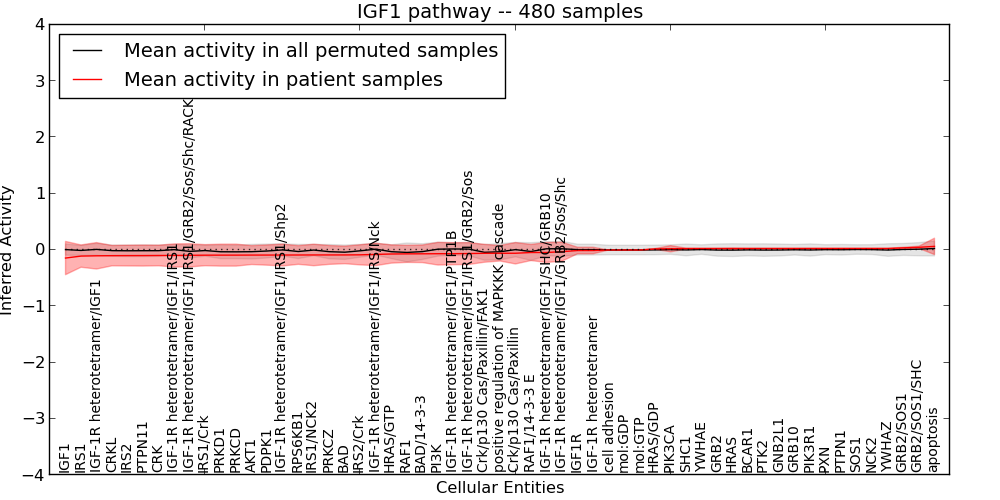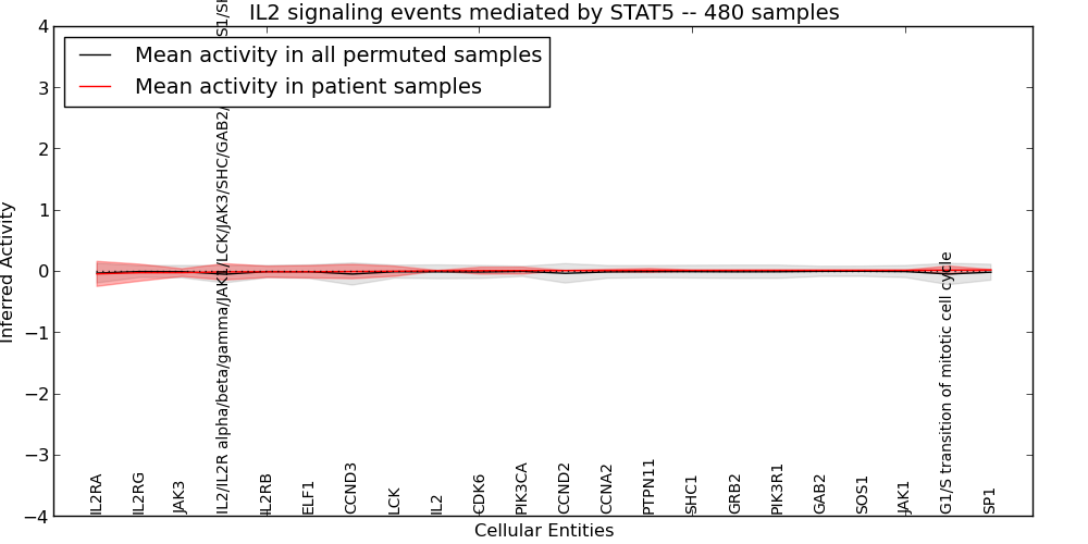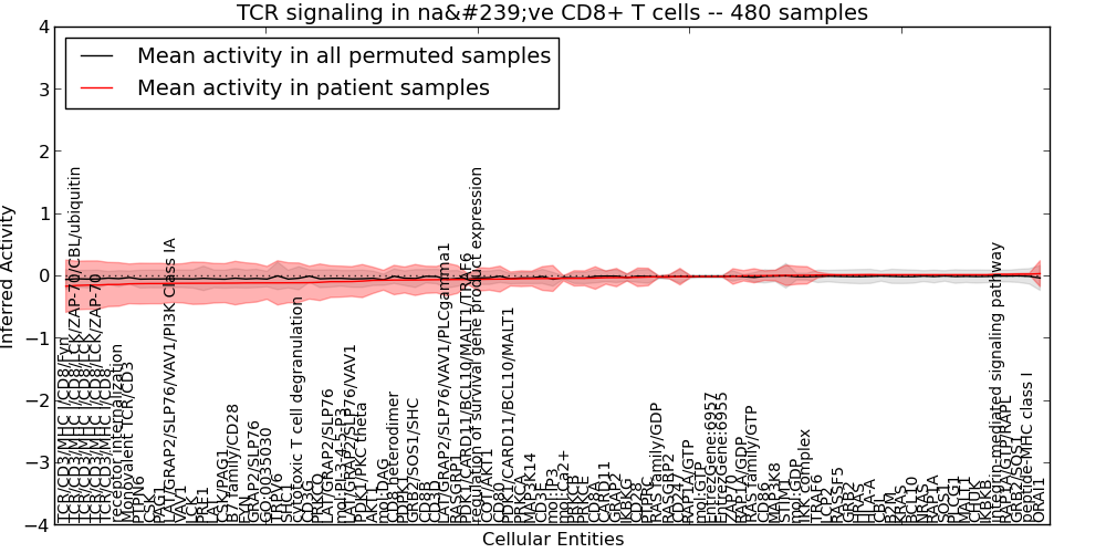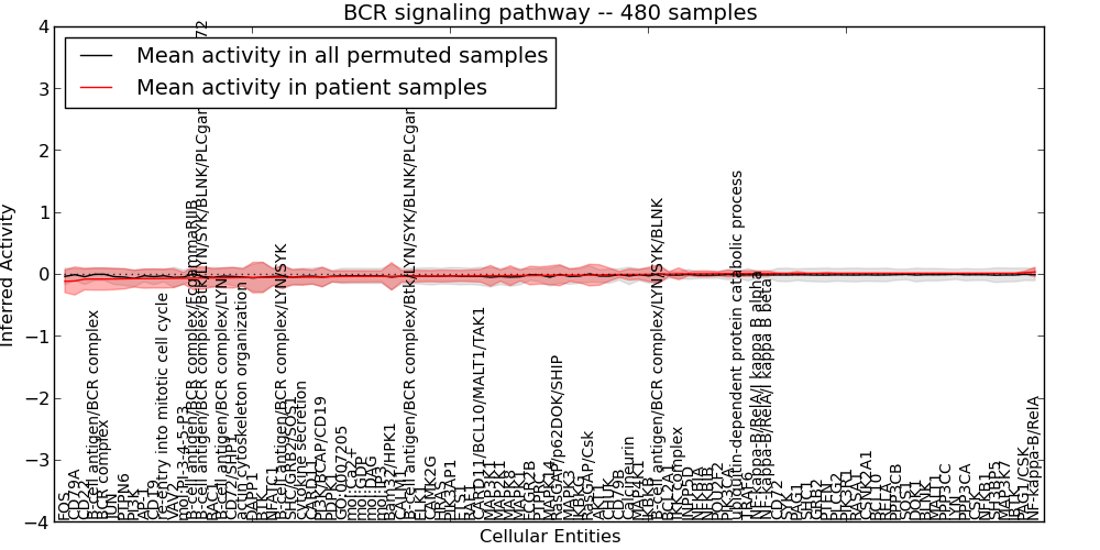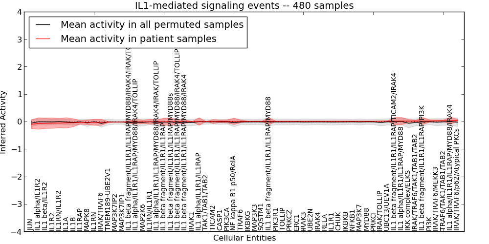 Figure S131. Get High-res Image This plot shows pathway concept perturbations across all samples against a permutation model. The concepts along the x-axis are sorted by lowest to highest mean activity for the real patient samples. Mean inferred activities are plotted along the y-axis as a colored band showing the average level and one standard deviation range. Real samples are shown in red and permuted samples in black.