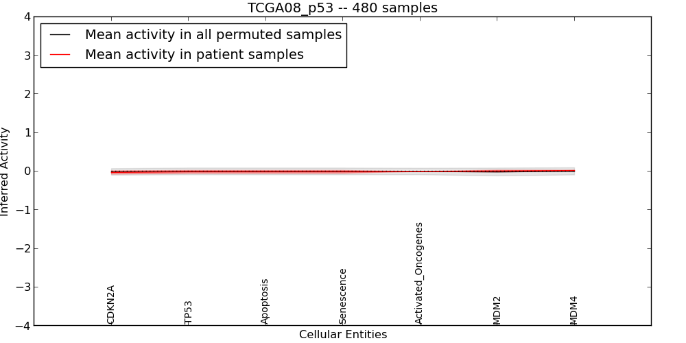 The significance of the IPL obtained for each concept in each patient sample is assessed using a permutation analysis. Importantly, the permutation analysis preserves data tuples so as to preserve any implicit correlations between the different data modalities. For example, genes that are deleted have concomitantly lower expression levels. Preserving the copy number and expression pairs therefore retains this data property. The simulation therefore makes "null samples" by permuting data tuples across all of the genes in the genome so that each gene in a null sample is associated with a random tuple of another gene with equal probability. This approach has the added benefit of preserving the pathway structure so that every observed IPL can be compared to a distribution of random IPLs derived from exactly the same interaction context. PARADIGM inferences are then obtained for 1000 "null" patients and serve as a background distribution to contrast the observed IPLs against. Pathway concepts are excluded from further analysis if they did not obtain a minimum IPL of 0.5 in any patient sample both observed or simulated.