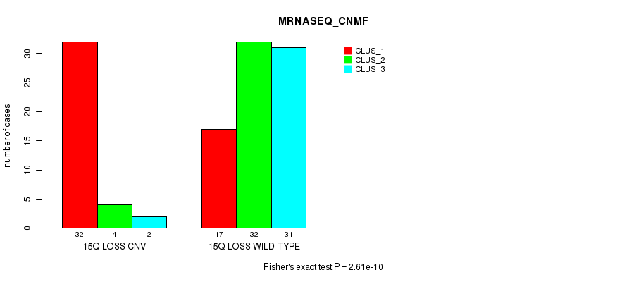 15q loss cnv correlated to 'MRNA_CHIERARCHICAL', 'CN_CNMF', 'METHLYATION_CNMF', 'MRNASEQ_CNMF', 'MRNASEQ_CHIERARCHICAL', 'MIRSEQ_CNMF', 'MIRSEQ_CHIERARCHICAL', 'MIRSEQ_MATURE_CNMF', and 'MIRSEQ_MATURE_CHIERARCHICAL'.