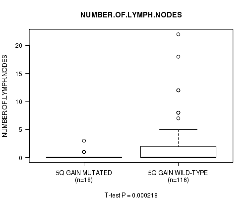 5q gain cnv correlated to 'NUMBER.OF.LYMPH.NODES'.