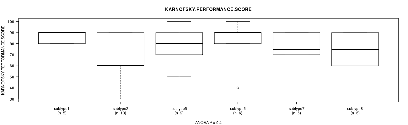 Figure S107. Get High-res Image Clustering Approach #10: 'MIRseq Mature cHierClus subtypes' versus Clinical Feature #8: 'KARNOFSKY.PERFORMANCE.SCORE'