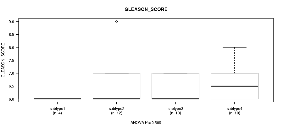 Table S120. Clustering Approach #10: 'MIRseq Mature cHierClus subtypes' versus Clinical Feature #11: 'GLEASON_SCORE'
