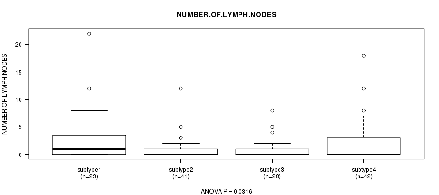 Table S119. Clustering Approach #10: 'MIRseq Mature cHierClus subtypes' versus Clinical Feature #10: 'NUMBER.OF.LYMPH.NODES'