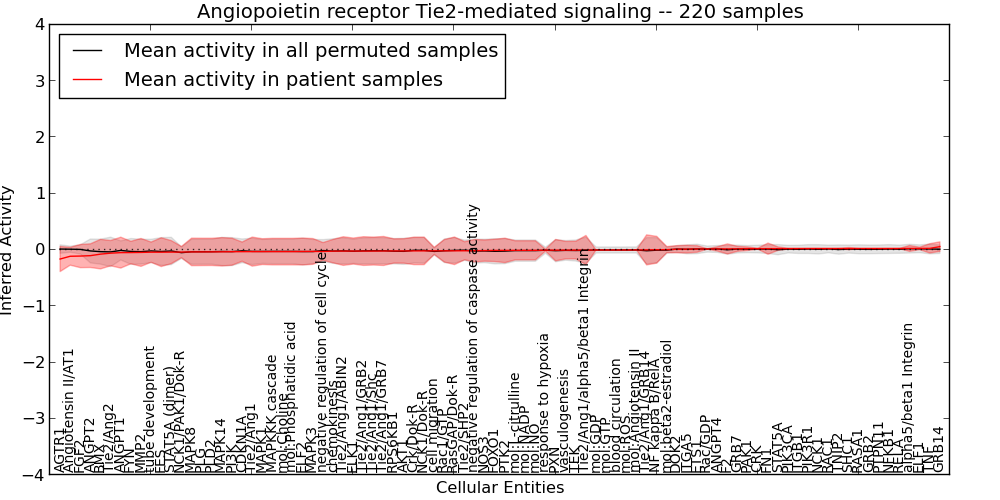 Figure S131. Get High-res Image This plot shows pathway concept perturbations across all samples against a permutation model. The concepts along the x-axis are sorted by lowest to highest mean activity for the real patient samples. Mean inferred activities are plotted along the y-axis as a colored band showing the average level and one standard deviation range. Real samples are shown in red and permuted samples in black.