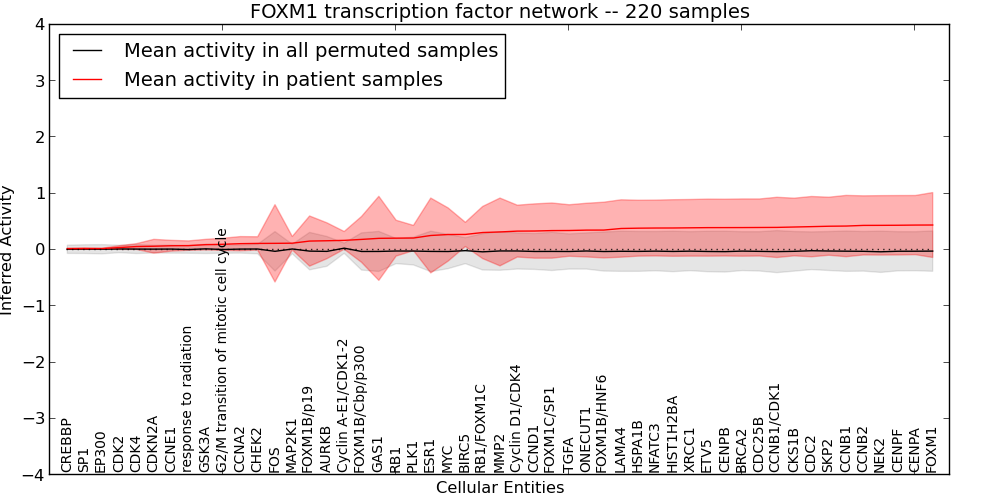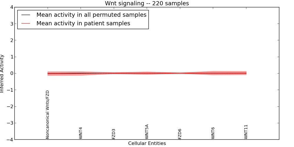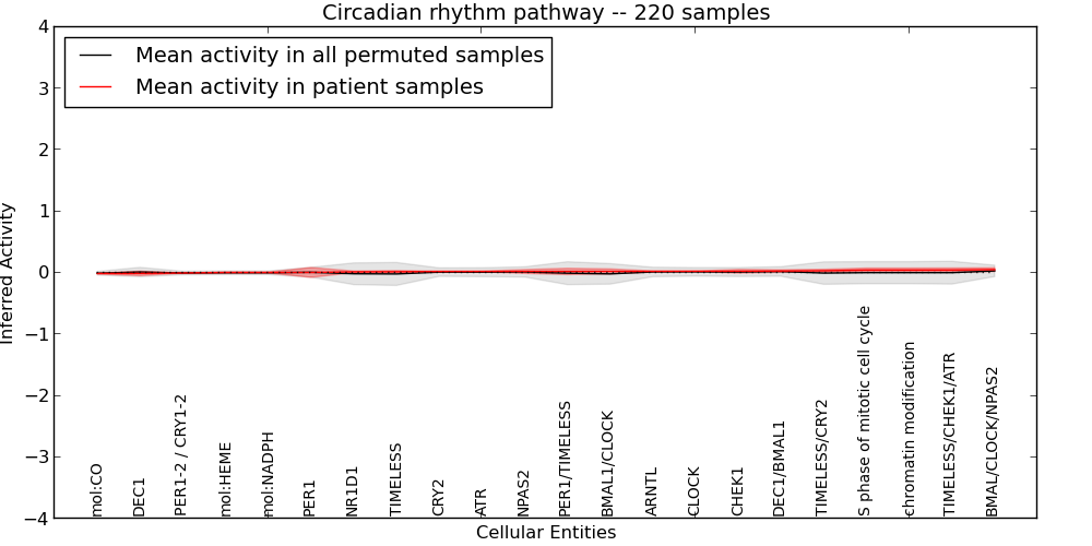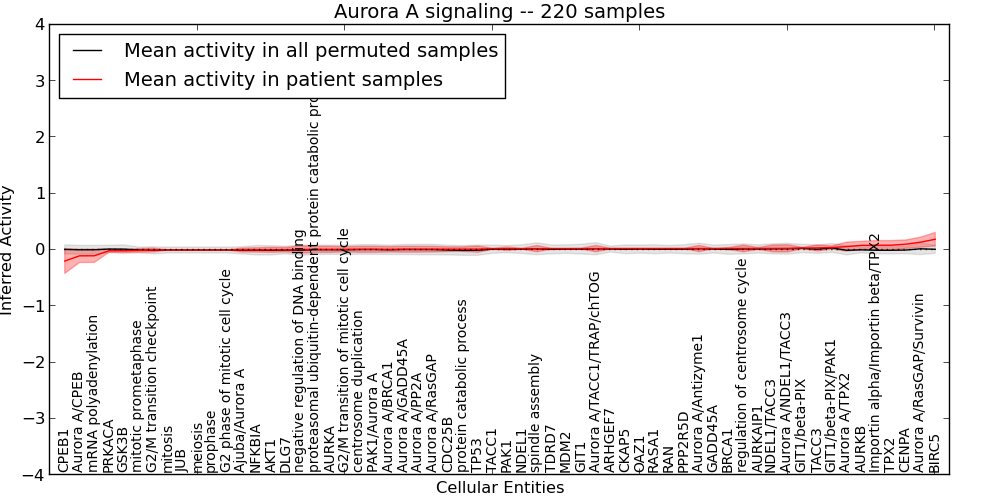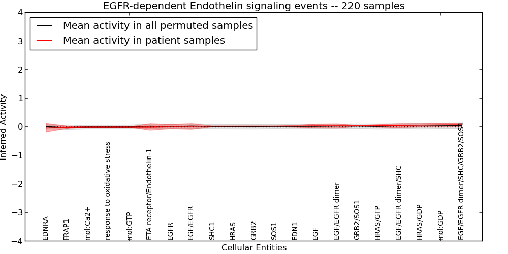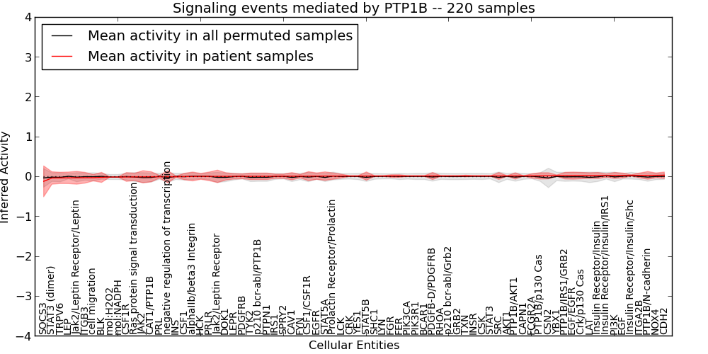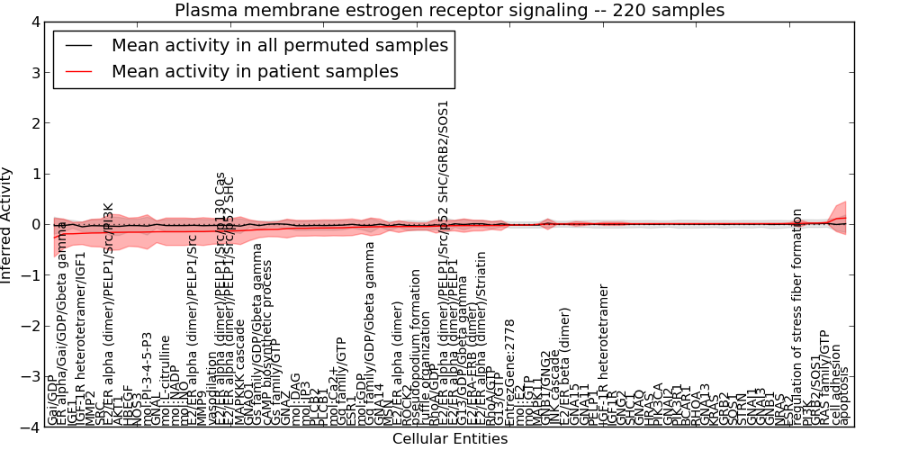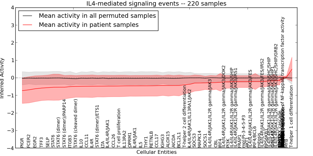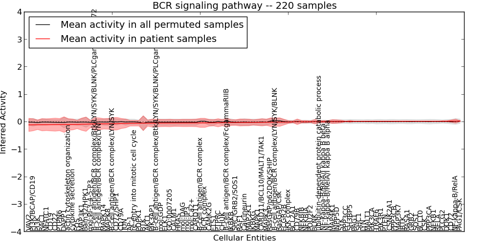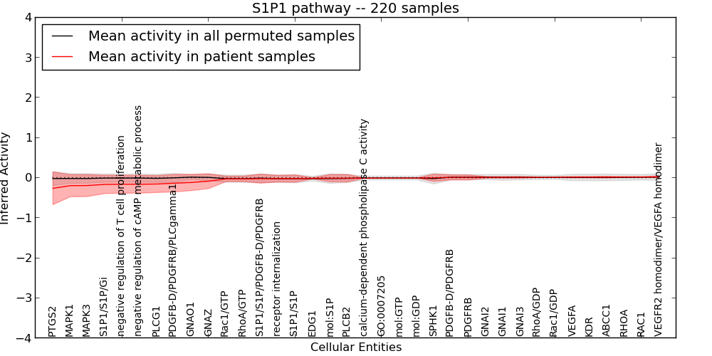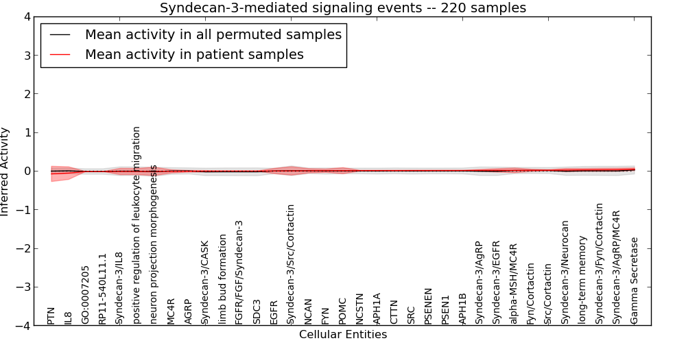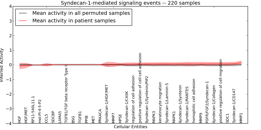 Figure S130. Get High-res Image This plot shows pathway concept perturbations across all samples against a permutation model. The concepts along the x-axis are sorted by lowest to highest mean activity for the real patient samples. Mean inferred activities are plotted along the y-axis as a colored band showing the average level and one standard deviation range. Real samples are shown in red and permuted samples in black.