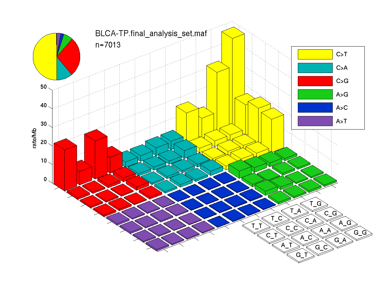 The mutation spectrum is depicted in the lego plots below in which the 96 possible mutation types are subdivided into six large blocks, color-coded to reflect the base substitution type. Each large block is further subdivided into the 16 possible pairs of 5' and 3' neighbors, as listed in the 4x4 trinucleotide context legend. The height of each block corresponds to the mutation frequency for that kind of mutation (counts of mutations normalized by the base coverage in a given bin). The shape of the spectrum is a signature for dominant mutational mechanisms in different tumor types.