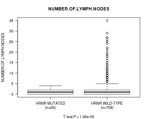 Figure S16. Get High-res Image Gene #62: 'HRNR MUTATION STATUS' versus Clinical Feature #10: 'NUMBER.OF.LYMPH.NODES'