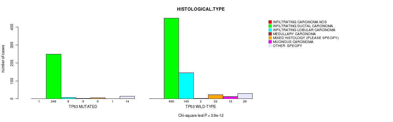 TP53 mutation correlated to 'HISTOLOGICAL.TYPE'.