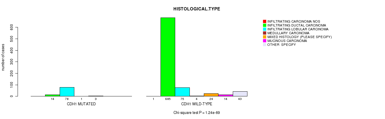 CDH1 mutation correlated to 'PATHOLOGY.T.STAGE' and 'HISTOLOGICAL.TYPE'.