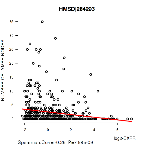 Figure S9. Get High-res Image As an example, this figure shows the association of HMSD|284293 to 'NUMBER.OF.LYMPH.NODES'. P value = 7.98e-09 with Spearman correlation analysis. The straight line presents the best linear regression.